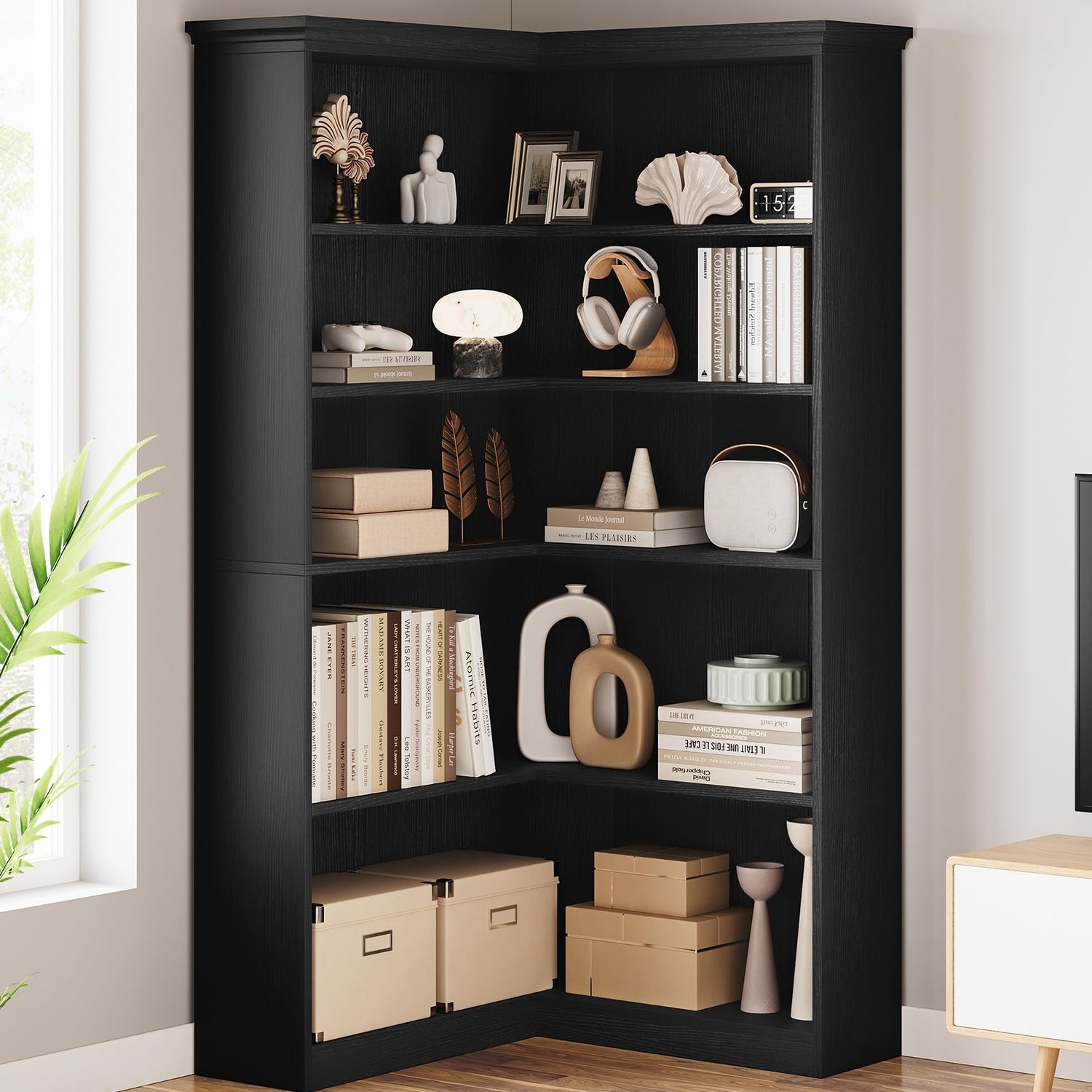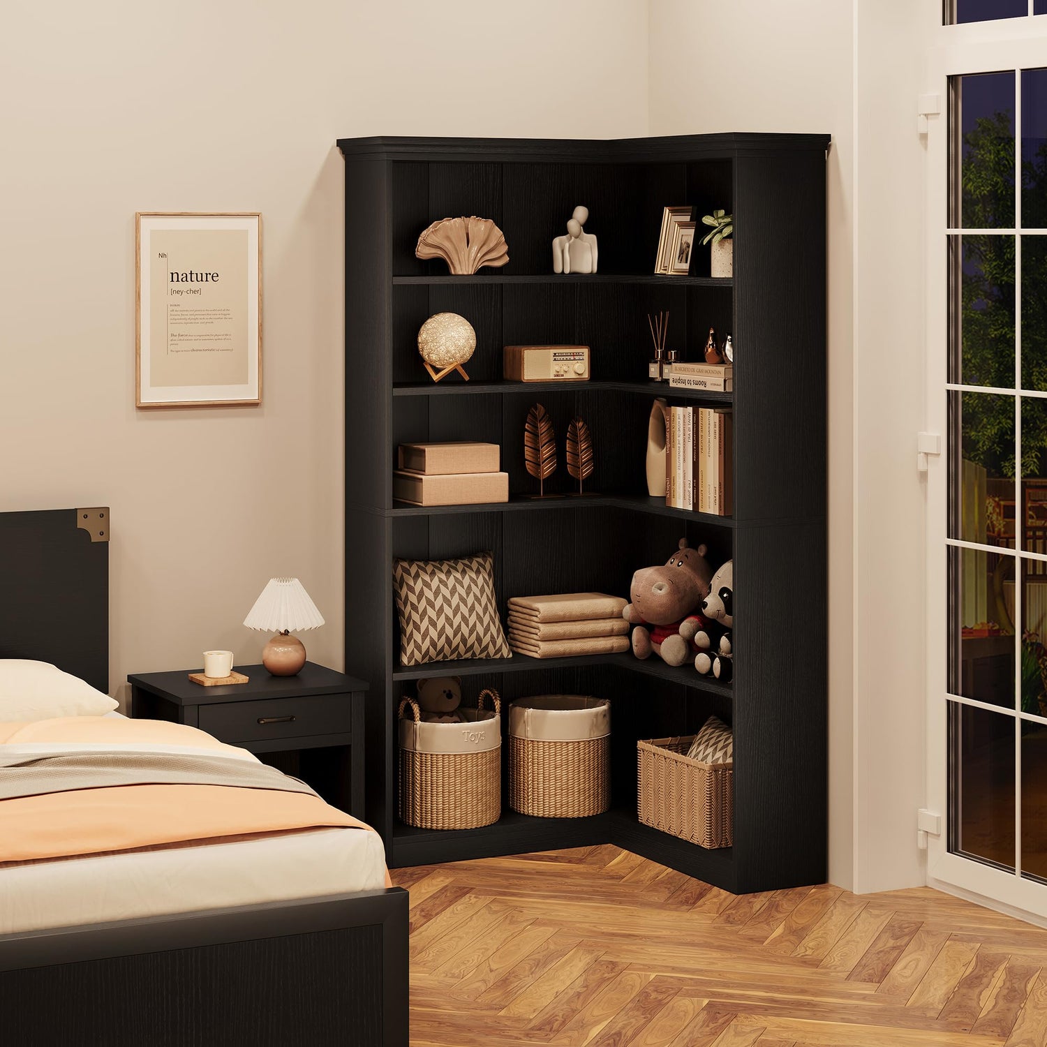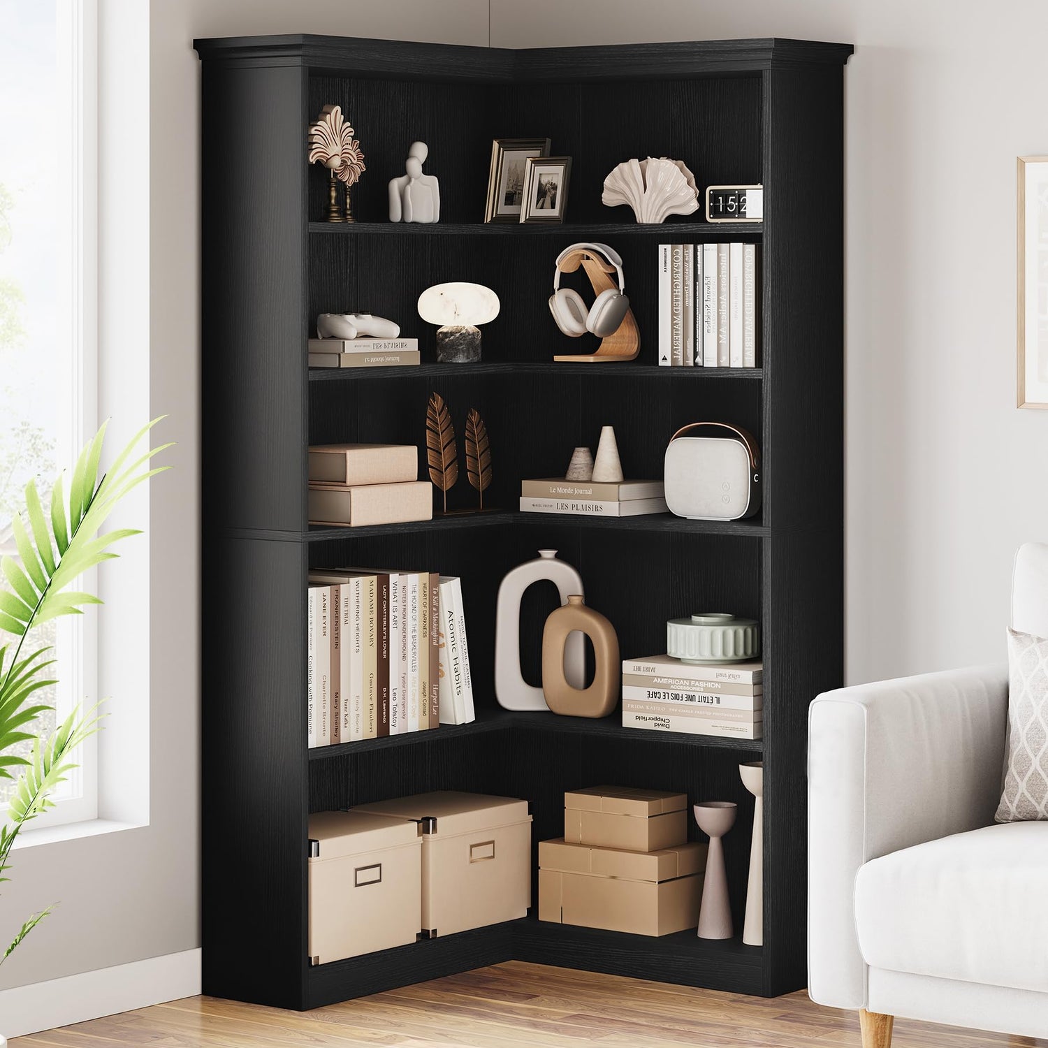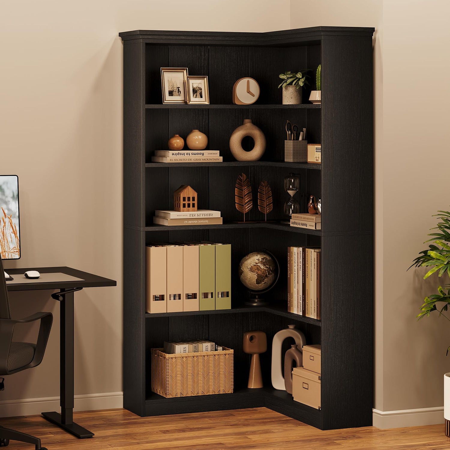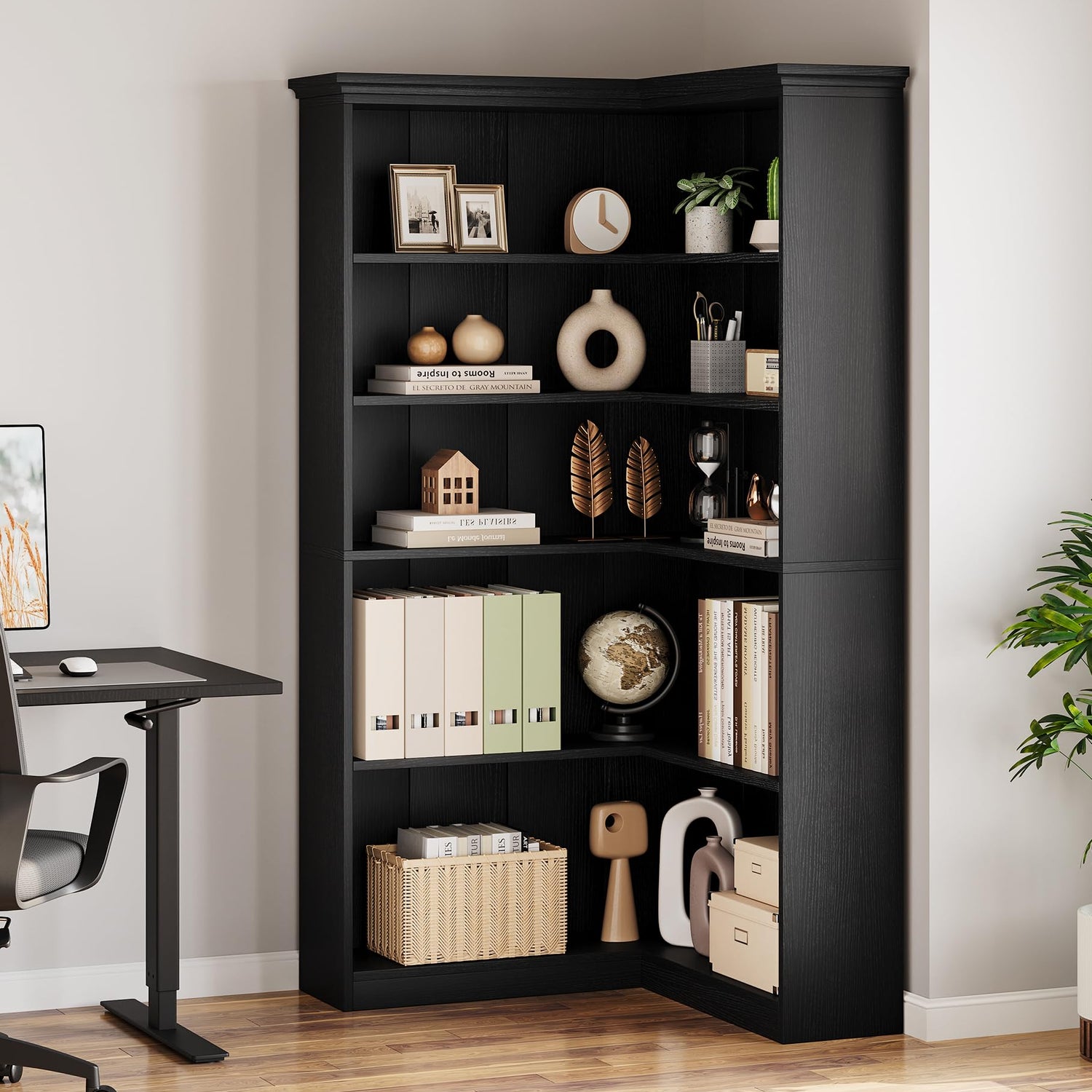 IDEALHOUSE Corner Bookshelf 72.8in Farmhouse Bookcase Large Bookshelf Wood Bookcase Tall 5 Tier Corner Shelf L Shaped Bookshelfs Storage Display Rack Living Room Bedroom (Black Full Panel)