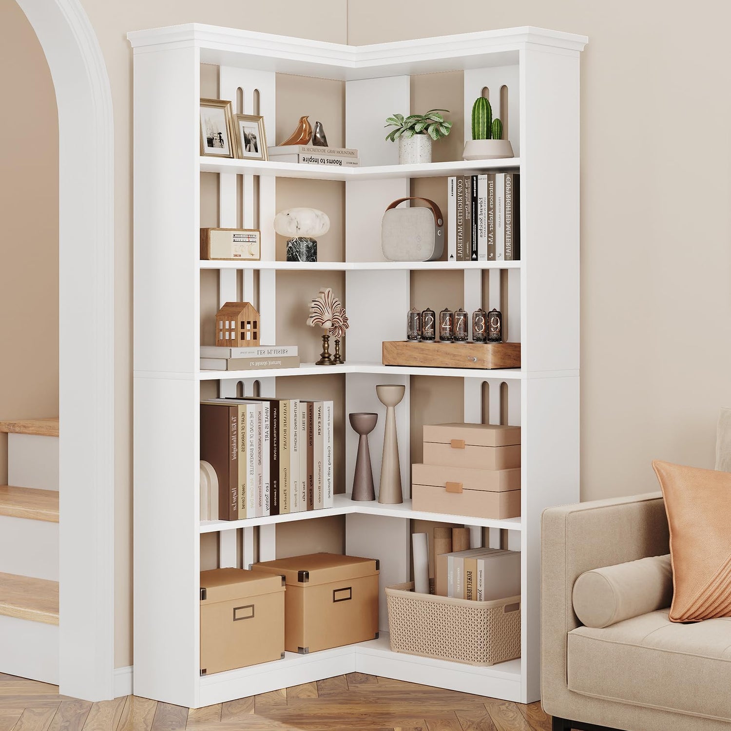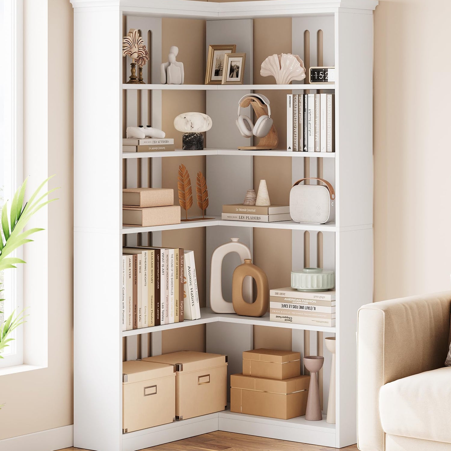- [Built to Last] This tall corner bookshelf is crafted from premium scratch-resistant MDF boards to ensure long-lasting durability for daily use. Each tier can support up to 60 pounds, offering abundant storage space. Besides, the inclusion of anti-tipping straps not only enhances the safety and stability of this tall bookshelf but also provides peace of mind by securing it firmly in place, preventing any risk of accidental tipping or instability. In addition, with no tiny gaps to trap dust or st
