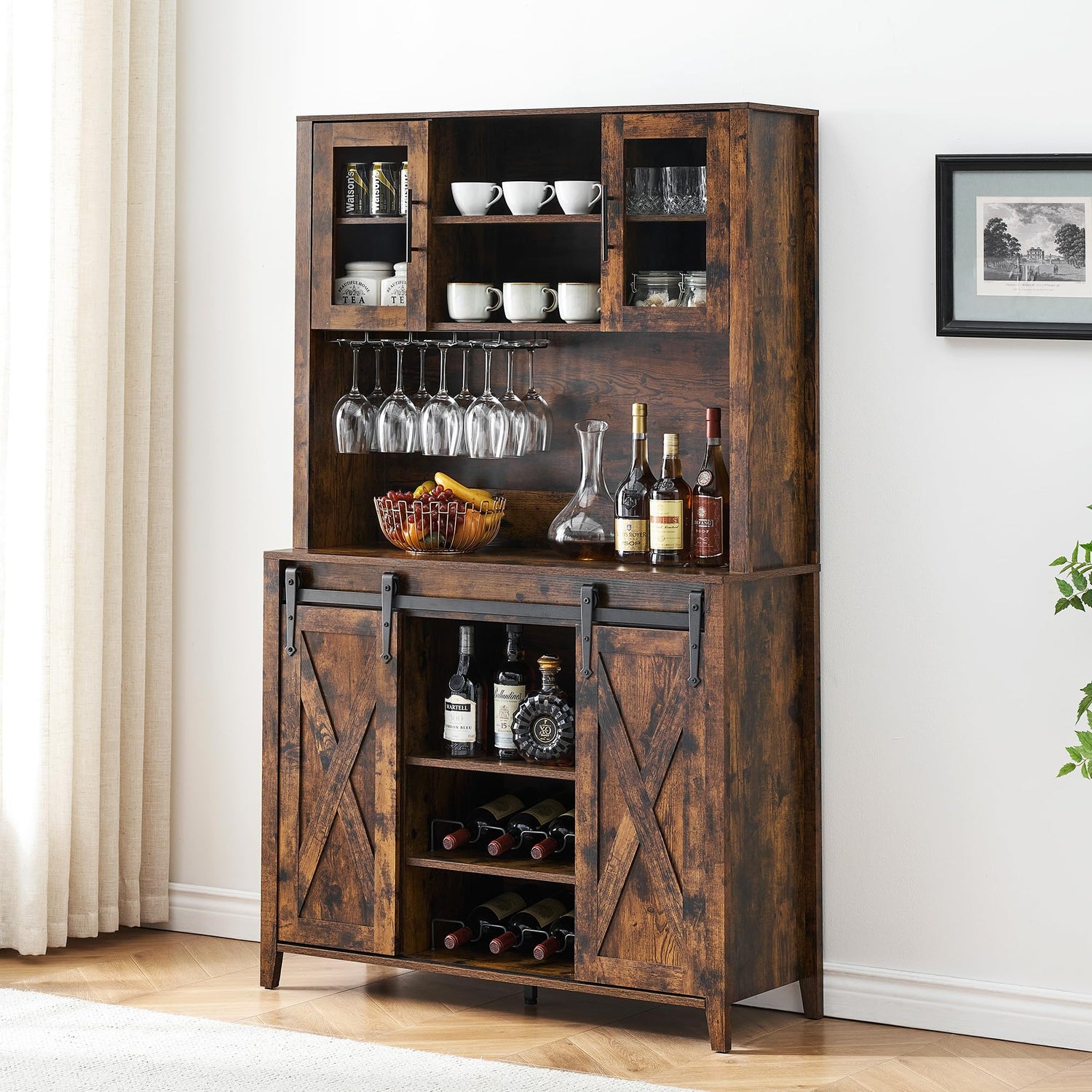 - 【Farmhouse Bar Cabinet with Sliding Barn Door】Featuring two flexible sliding barn doors, this rustic wine cabinet provides easy access to storage while saving space. The sliding door with farmhouse sign create an elegant, farmhouse ambiance in your living space. Flexibly use it as a alcohol cabinet, kitchen pantry, china cabinet, coffee bar station, microwave stand, kitchen cupboard, credenza, storage cabinet.