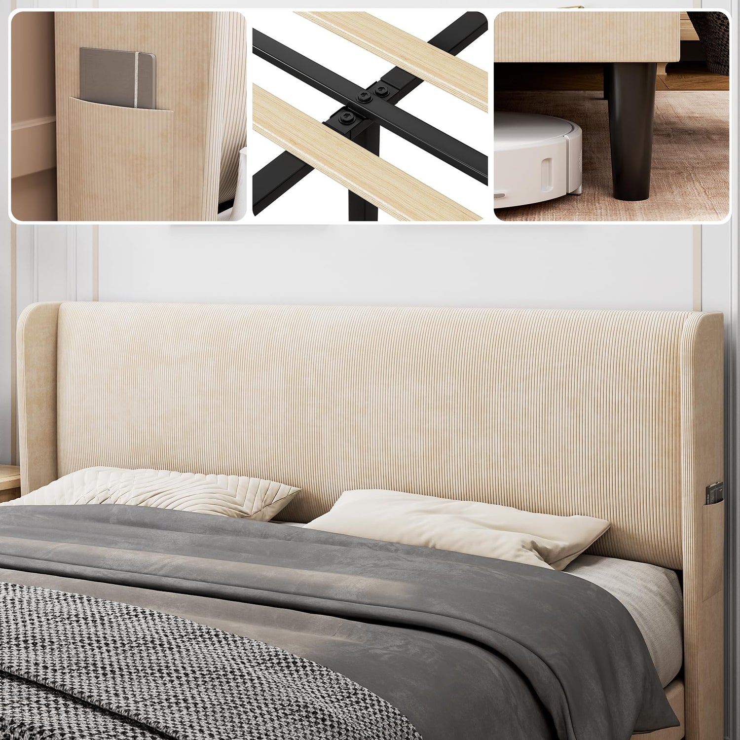 - Luxurious Velvet Upholstery: The bed frame full size features sumptuous velvet and soft sponge wrapping, adding a touch of elegance and inviting softness into your space. Additionally, two convenient storage pockets at the headside offer a practical solution for keeping your belongings easily accessible.