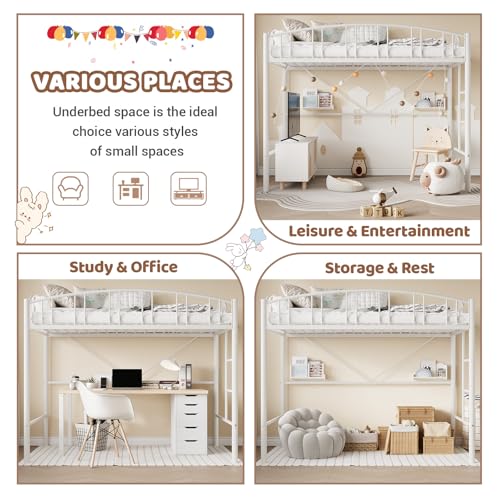 IDEALHOUSE Loft Bed Twin Size with Ladder and High-Arched Guardrail, Sturdy Metal Slats, Space-Saving Design, Modern Decor Style, Easy Assembly, No Box Spring Needed, Safe for Kids/Adults, White