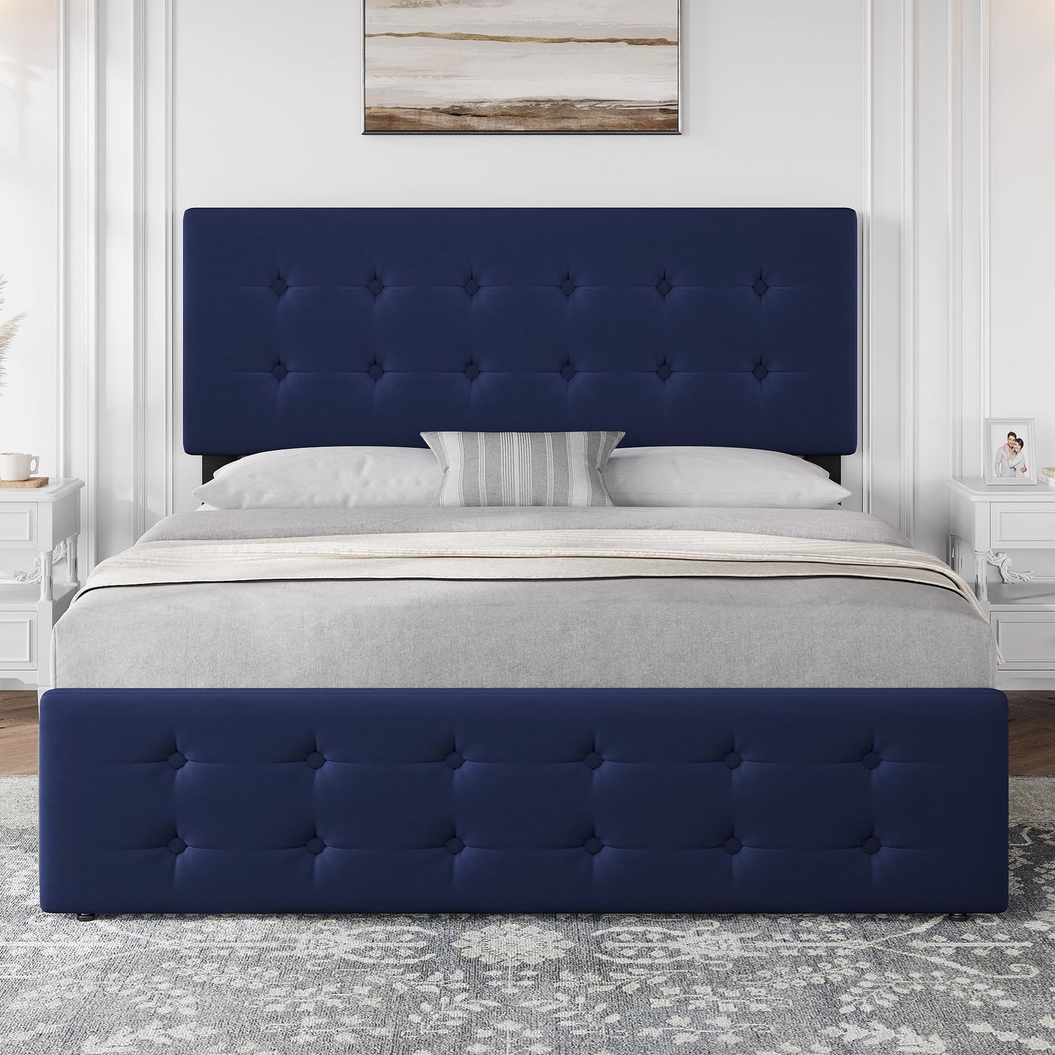 IDEALHOUSE Queen Size Bed Frame with 4 Storage Drawers and Headboard, Velvet Upholstered Platform Bed Frame with Wooden Slats Support, Button Tufted Design, No Box Spring Needed, Blue