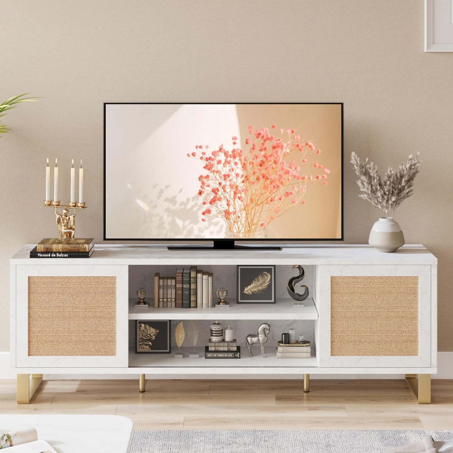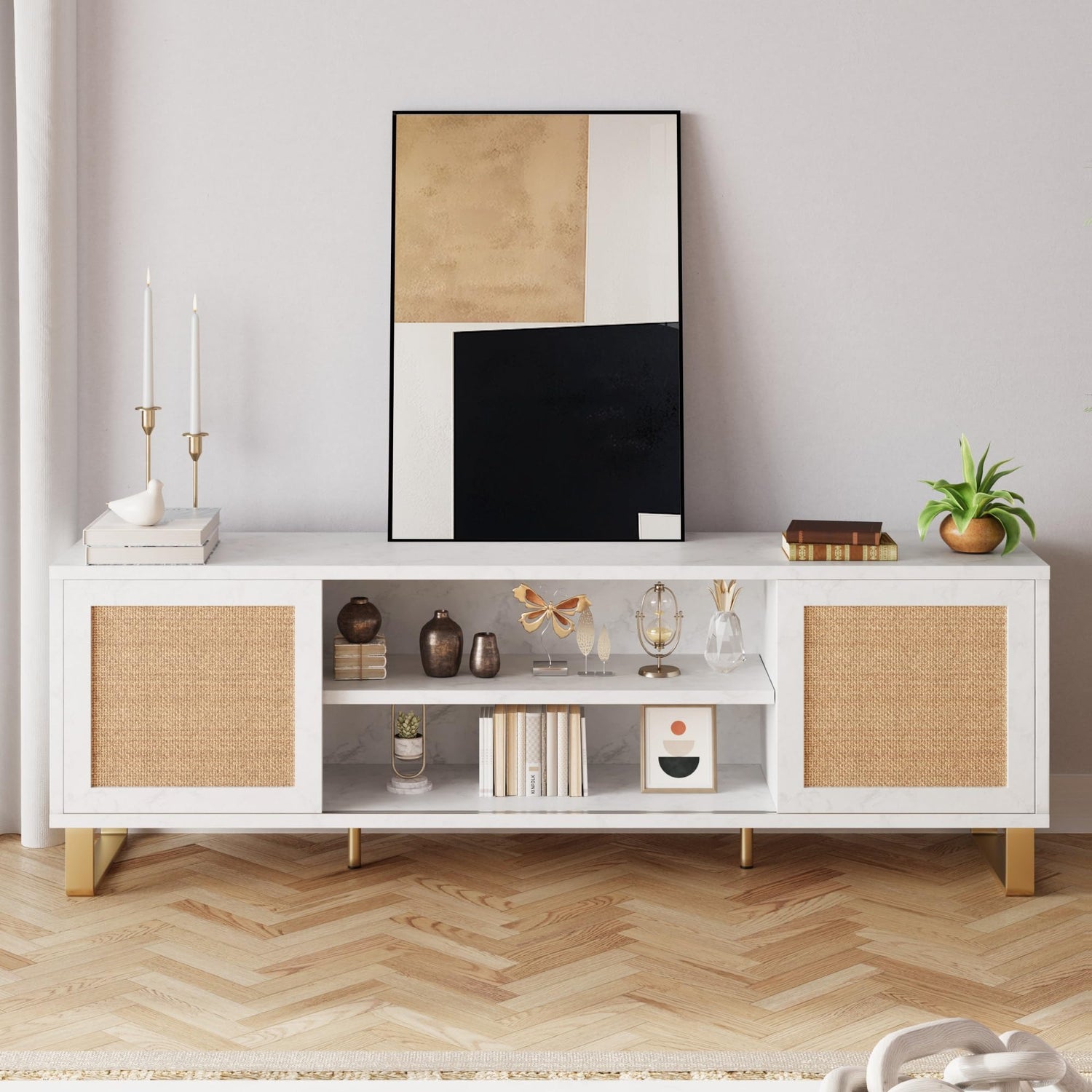 - CHIC DESIGN: This TV stand perfectly combines the white entertainment center with rattan door, blending modern and boho styles well, the golden table legs make the whole look more gorgeous, and this design makes the appearance more fashionable and bring a perfect visual experience. The cabinet door combines handmade rattan with wood grain, with clean lines and natural tone, adding to its overall color design that can be easily integrated into your life and is suitable for most decoration styles