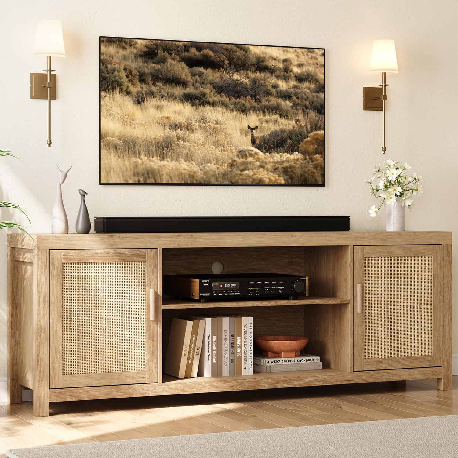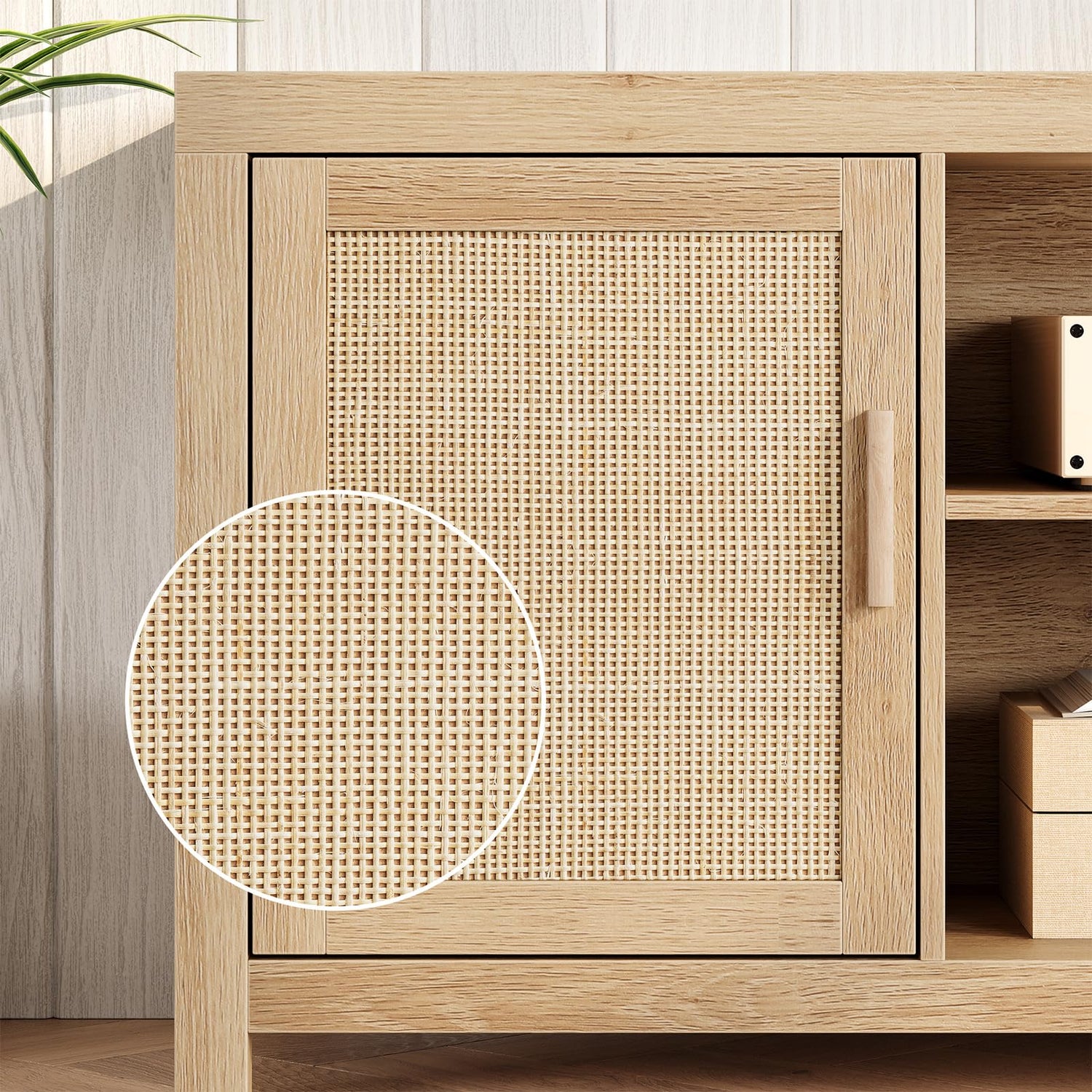 - RATTAN BOHO DESIGN - This TV stand adopts a boho style design, which makes it more fashionable and brings a perfect visual experience. The cabinet doors combine handcrafted natural rattan with wood grain as well as clean lines and natural tones, adding a cool and boho vibe to your home, suitable for most home decoration styles