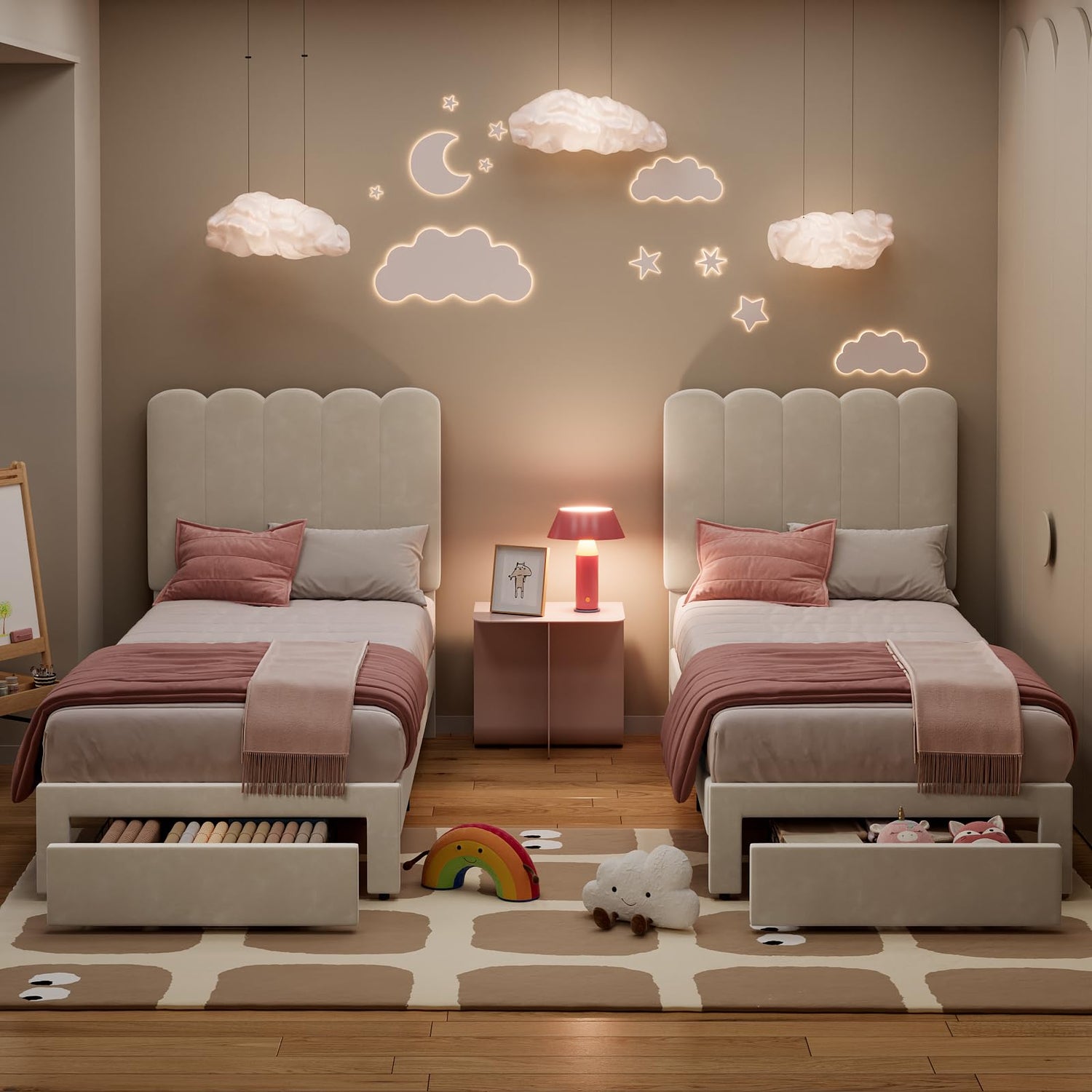 IDEALHOUSE Twin Bed Frame with Storage Drawer and Headboard, Velvet Upholstered Twin Platform Bed Frame for Girls, Strong Wooden Slats Support, Noise-Free, Easy Assembly (Beige)