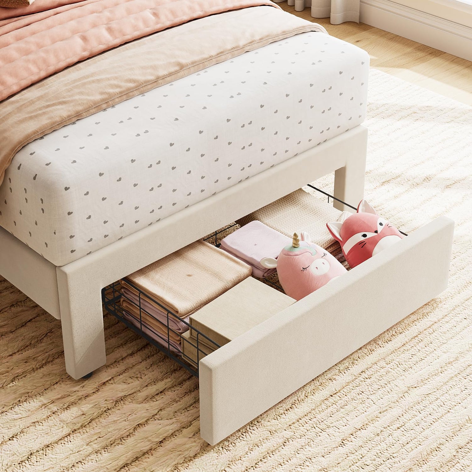 - Twin Bed with Storage Drawer - This upholstered twin bed frame has a great storage feature! The footboard has a pull-out drawer with wheels that measures 26.4 x 16.9 x 4.9 inches, perfect for storing socks, small clothing items, and other odds and ends. Plus, there is an additional 6.3 inches of under-bed storage space for even more storage options