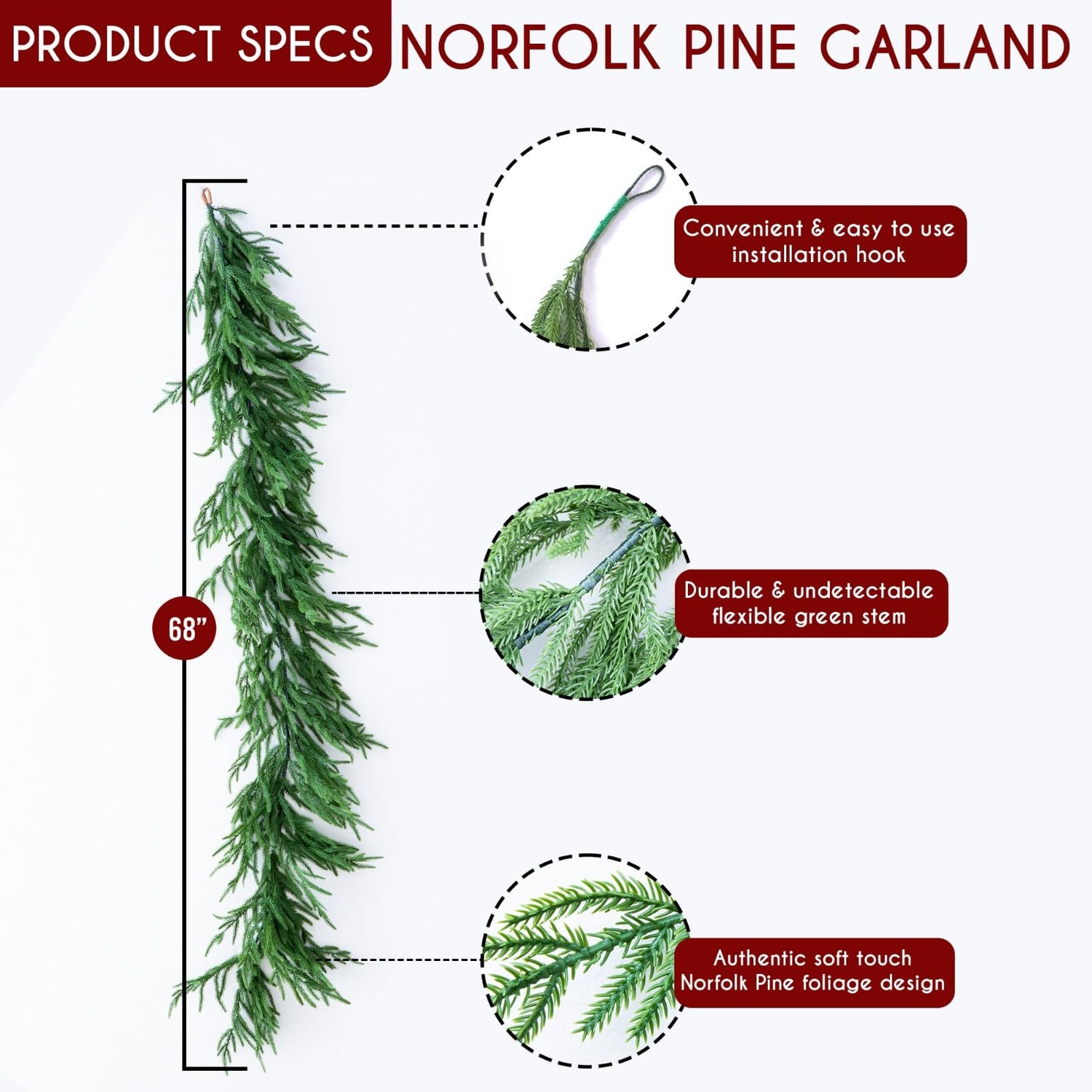 • 68" Length: This Norfolk Pine Garland provides ample coverage for your decorating needs. Its impressive length and realistic appearance make it a standout Faux Christmas Garland for any occasion.