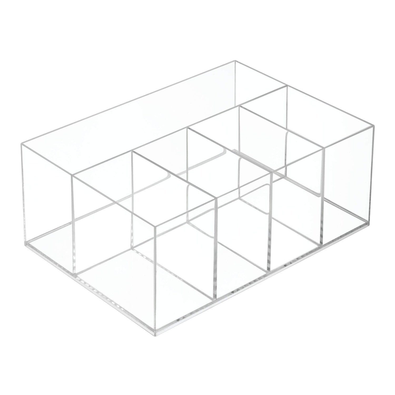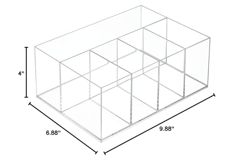 Details: Make the most of your storage space with the iDesign Clarity Divided Vanity Organizer. This divided organizer features five compartments to store and organize taller items such as makeup, cosmetics, brushes, skincare, lotions, soaps, and more on bathroom and vanity countertops. The transparent plastic sides and open top ensure contents are always visible and accessible, and the modular design can be paired with additional Clarity organizers (sold separately) to offer customized storage. This versatile organizer can also be used in the bedroom, closet, office, kitchen, pantry, or in any room around the home that you need additional organization. Made with durable BPA-free clear plastic, this organizer is made to last and is easy to clean with mild soap and water. Measuring 9.88" x 6.88" x 4", it creates instant organization in compact spaces. With iDesign by InterDesign, you can #LiveSimply every day.
