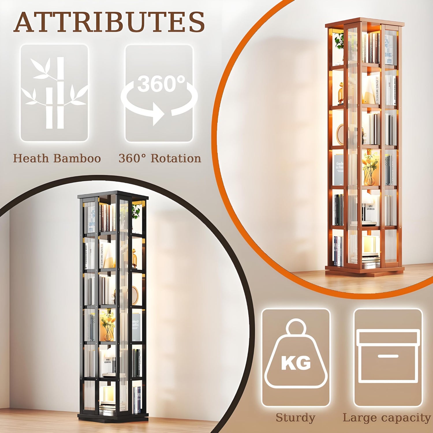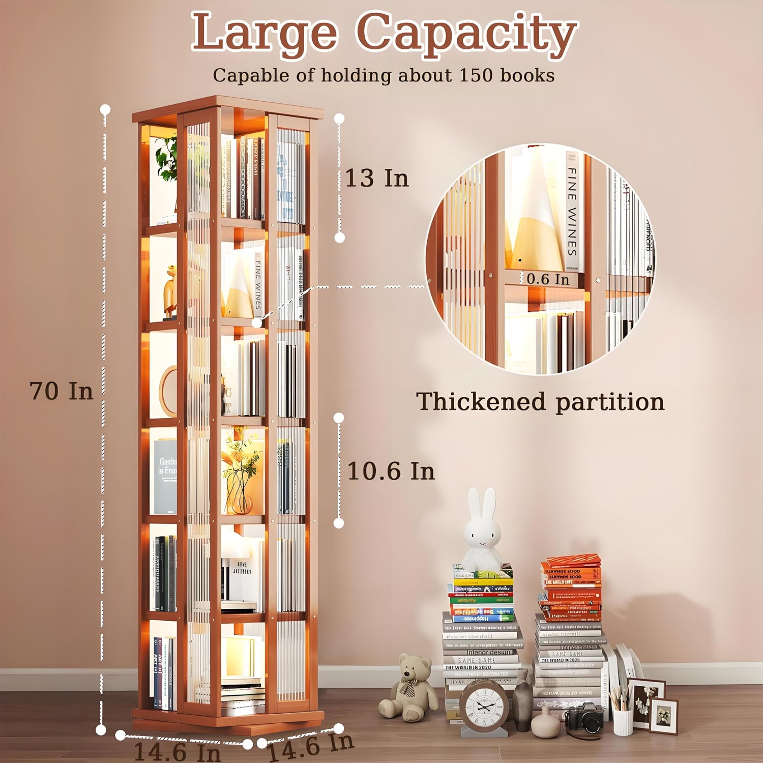 - 【Ultimate Space Utilization】- The rotating bookshelf has an ultra-small base of 14.6"×14.6", which only requires 1 square foot of space against the wall. The 68-inch vertical height perfectly utilizes the height of the Tier, saying goodbye to the bloated space occupied by traditional bookshelves, which is a blessing for small apartments