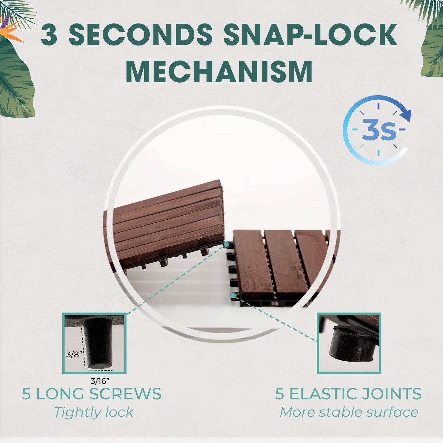Idzo Interlocking Deck Tiles - 10PCS Waterproof Acacia Wood Patio Tiles, Flooring Tiles for Both Indoor and Outdoor - Decking Stripe Pattern, Dark Brown, 12 x 12 x 0.9 inches