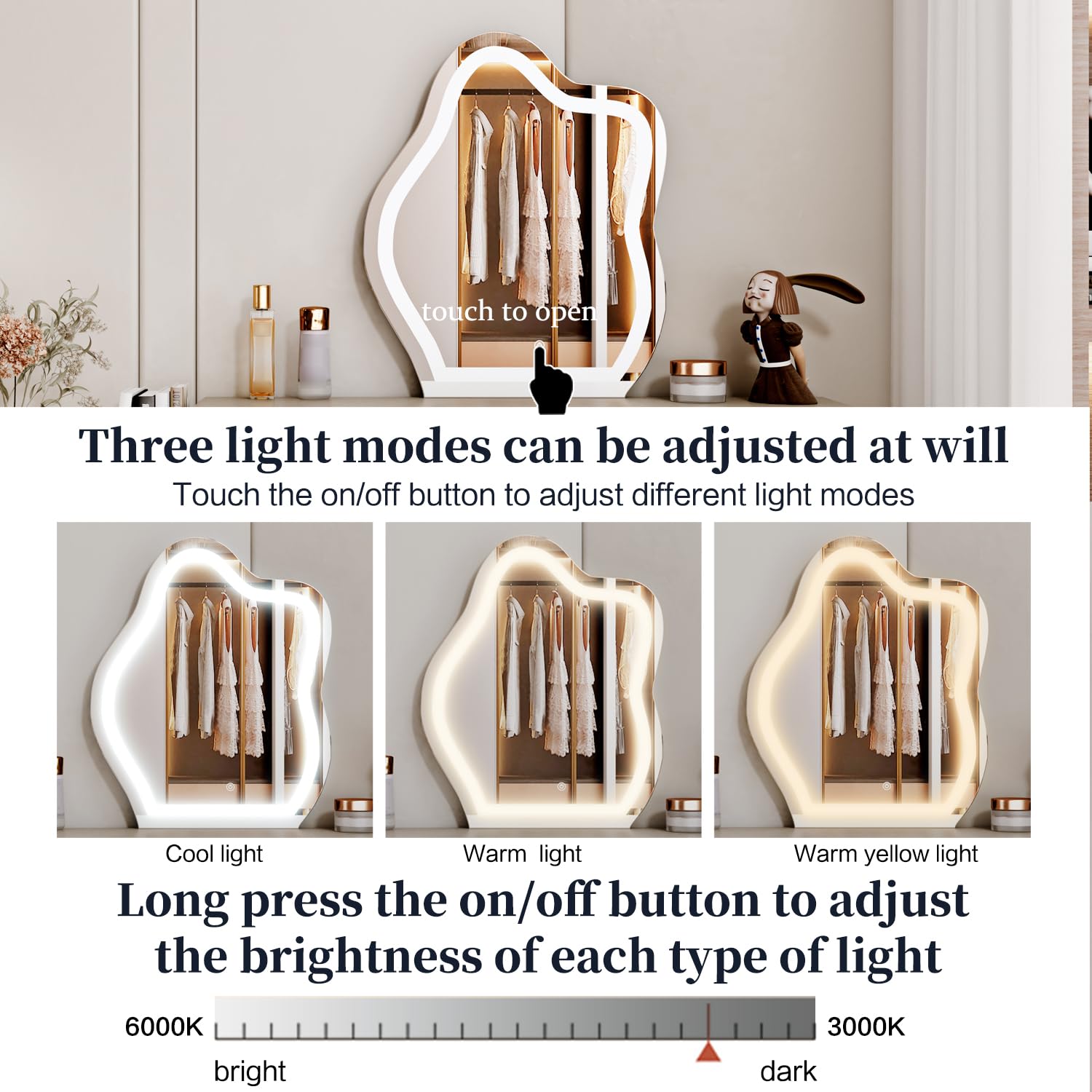 - 【3-Color LED Light】The vanity desk features a specially shaped dimmable lighting mirror with 3 different LED lighting colors, including natural, warm and cool light, for a variety of indoor lighting and environments to optimize your makeup