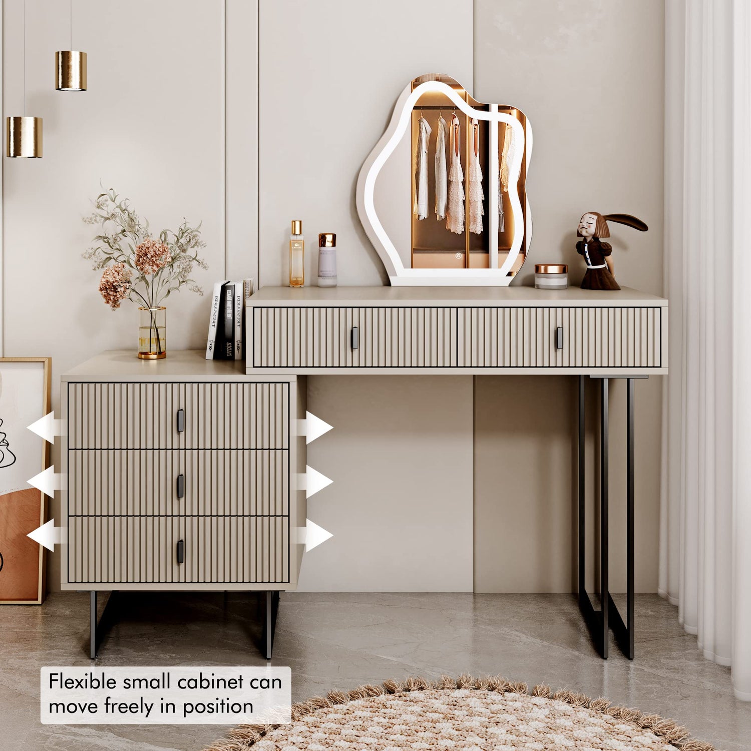 Ieejdn Makeup Vanity Desk with Cloud Lighted Mirror with Power Outlet and LED Strip, 3 Color Lighting Modes with Adjustable Brightness, 5 Large Drawer Vanity Table,for Bedroom, Grey