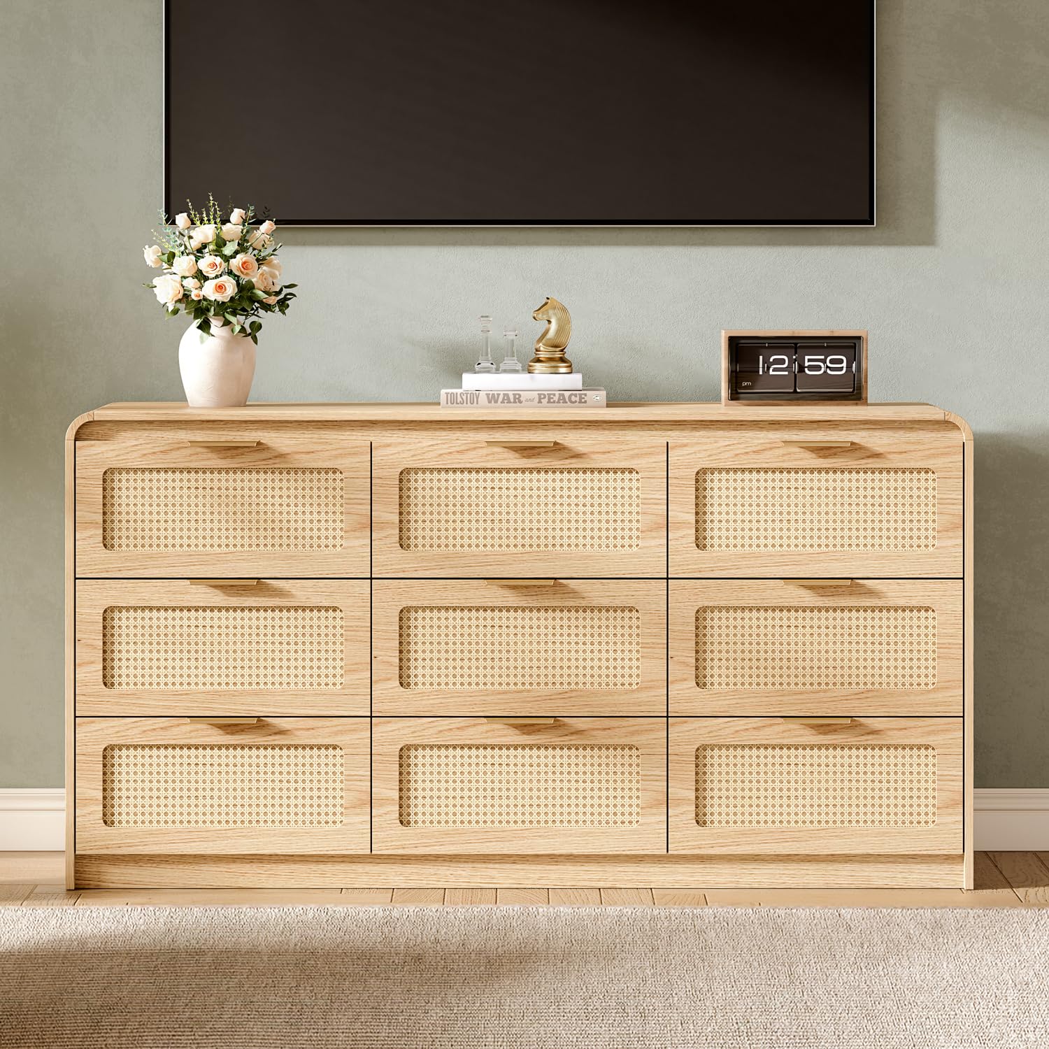 Ieejdn Mid Century Modern Dresser,Rattan 9 Drawers Dresser for Bedroom, 59" Wide Wood Dressers & Chests of Drawers/Curved Profile Design, Natural Texture for Bedroom, Living Room, Warm Wood