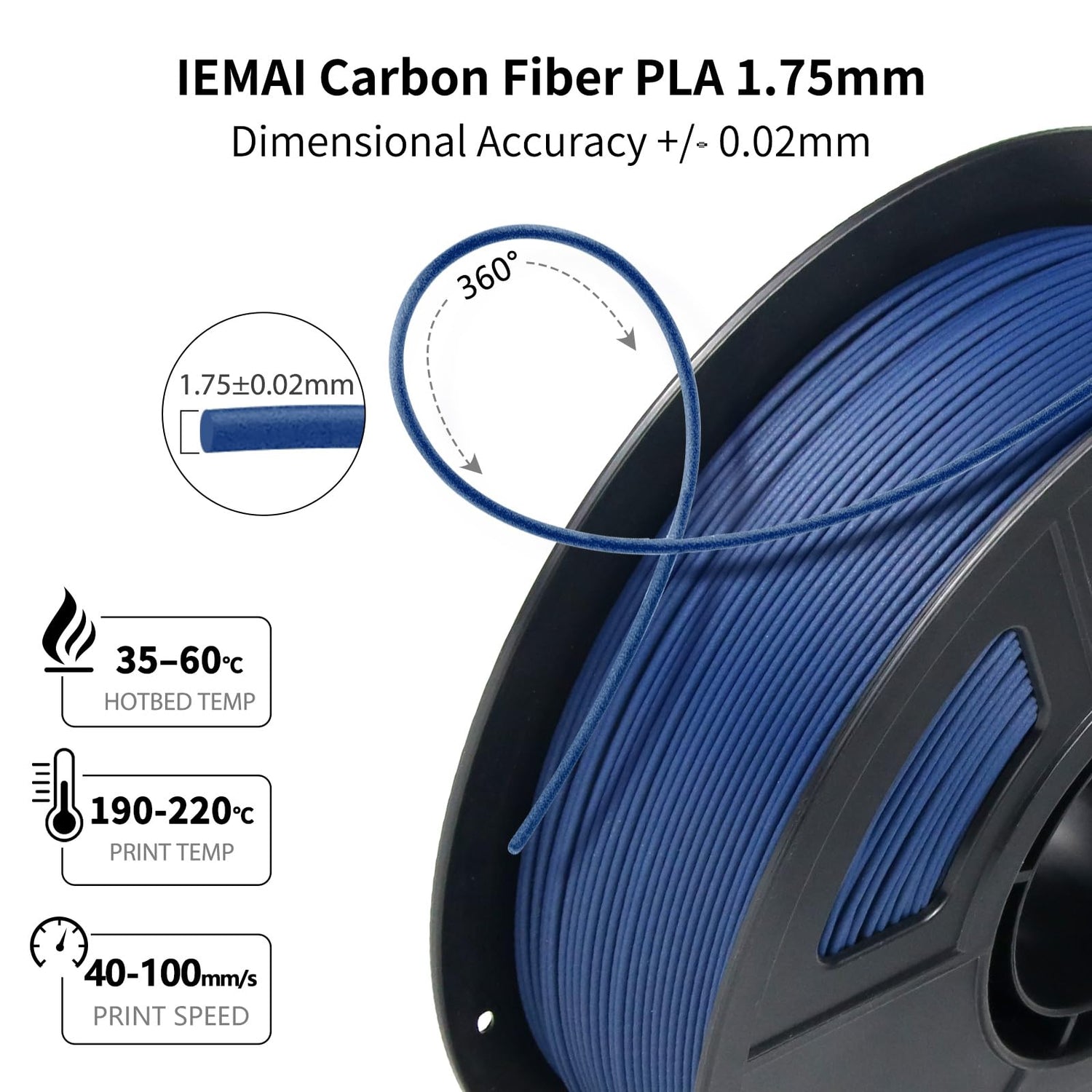 - 【Carbon Fiber PLA Filament】IEMAI carbon fiber filament 1.75mm uses materials imported from Germany, 15% Carbon Fiber + 85% Polylactic Acid. So the carbon fiber PLA filament is lighter and has higher stiffness, stronger tensile strength, higher heat resistance and chemical resistance, and low thermal expansion