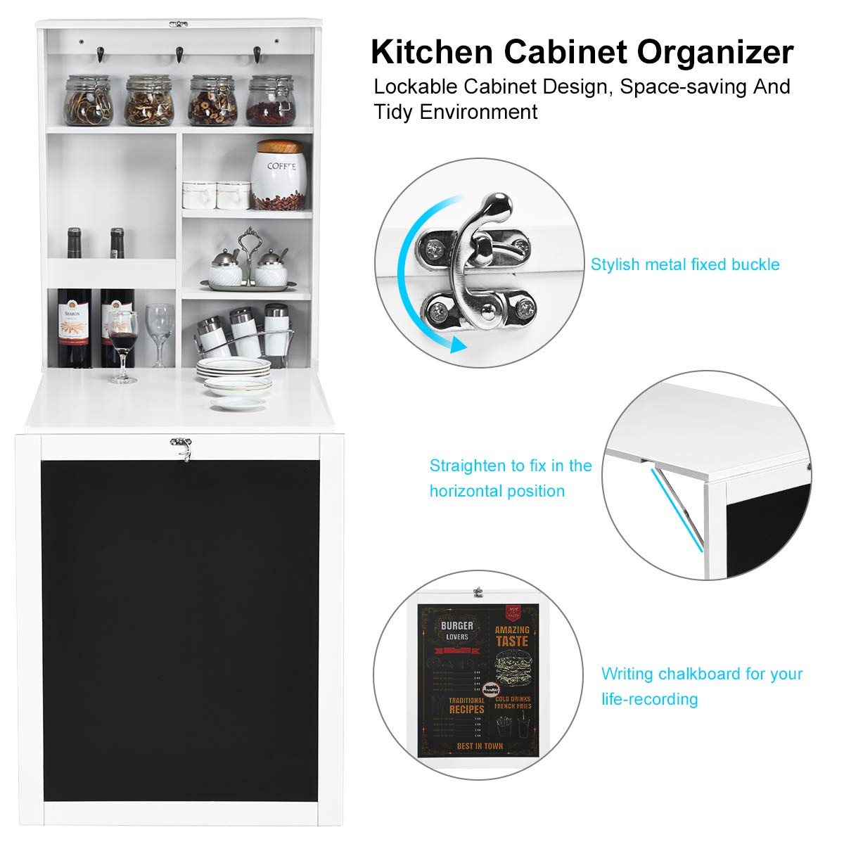 Do you need a hideaway desk for tight spaces? Take a look at our convertible desk. The folding design helps save space and avoid clutter in your room. It is quite easy to fold down with support under the tabletop and fold up with latch locked for safety use. You can leave notes on the chalkboard or doodle for fun. There are multiple open compartments and 3 hooks inside to satisfy your different storage needs. The high quality engineered wood ensures durability for long-term use. You can write, work and study on it and you can also sew, manicure and craft on it. It is also great to work as a breakfast station or mini bar. The multifunctional desk would serve the purpose well. Just buy one and it’s great value for money!
