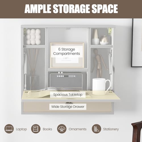 IFANNY Folding Wall Desk, Wood Wall Mounted Desk with Storage Drawer and Shelves, Fold Down Wall Mount Laptop Desk, Corner Floating Desk for Small Spaces (White)