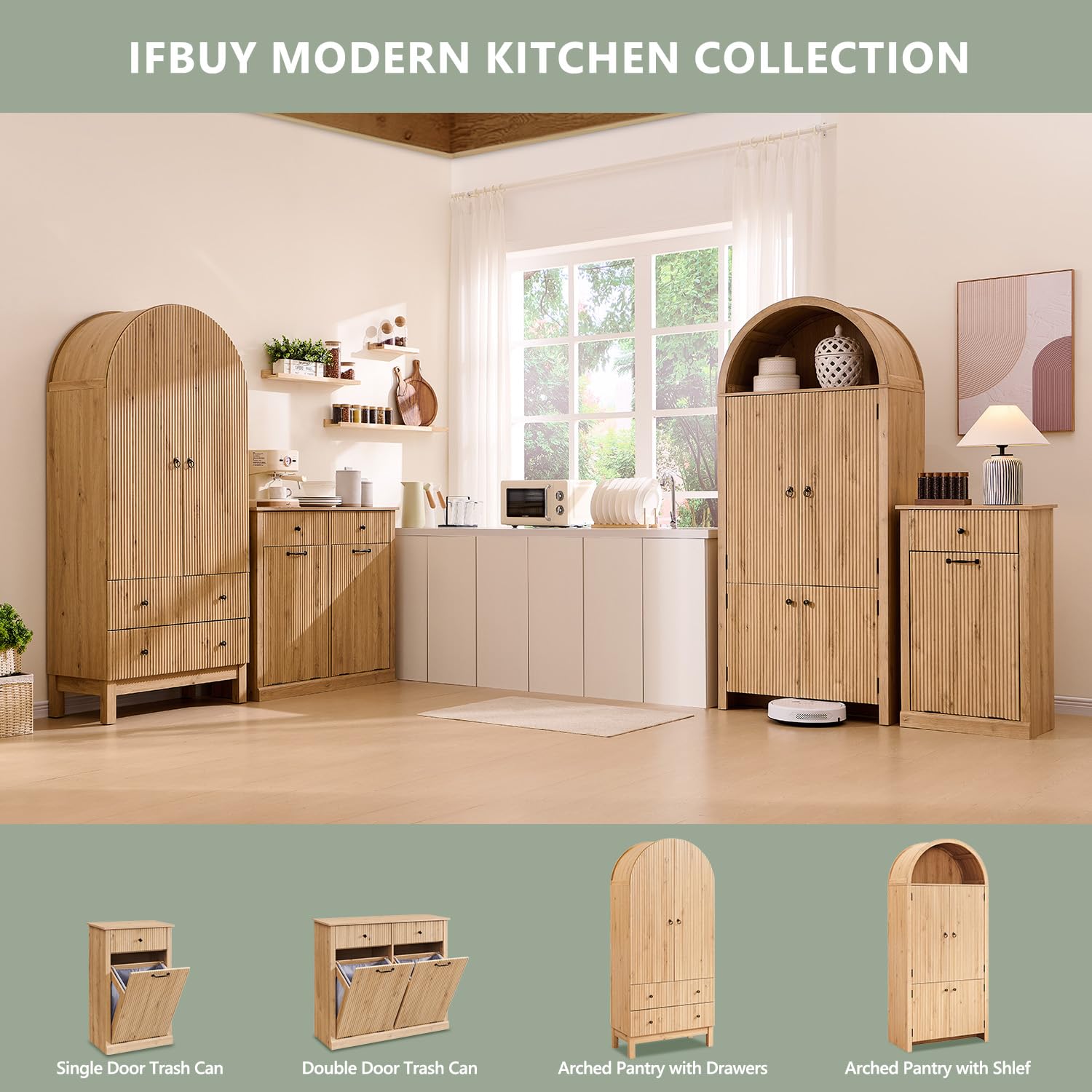 IFBUY 71" Tall Arched Bookcase with Doors, Morden Fluted Bookshelf with Storage & 3 Adjustable Shelves, 6 Door Shelves, Wooden Floor Standing Versatile Cupboard for Home Office, Living Room, Natural
