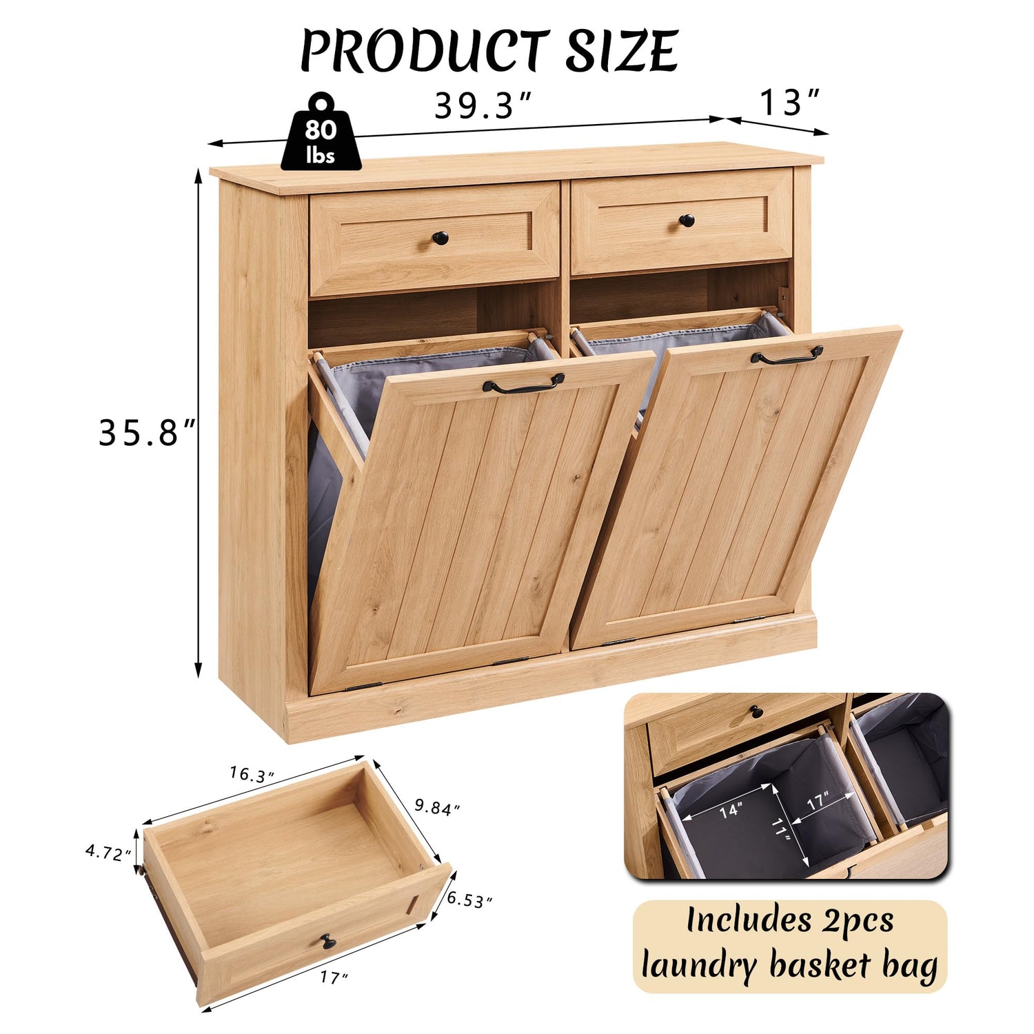 - 【Double Tilt Out Laundry Hamper】Cabinet Dimensions: 13"D x 39.3"W x 35.8"H. Drawer Dimensions: 9.84"D x 17"W x 6.53"H. This laundry hamper cabinet holds 2 x 10 gallon trash can. (Includes 2pcs laundry basket.)