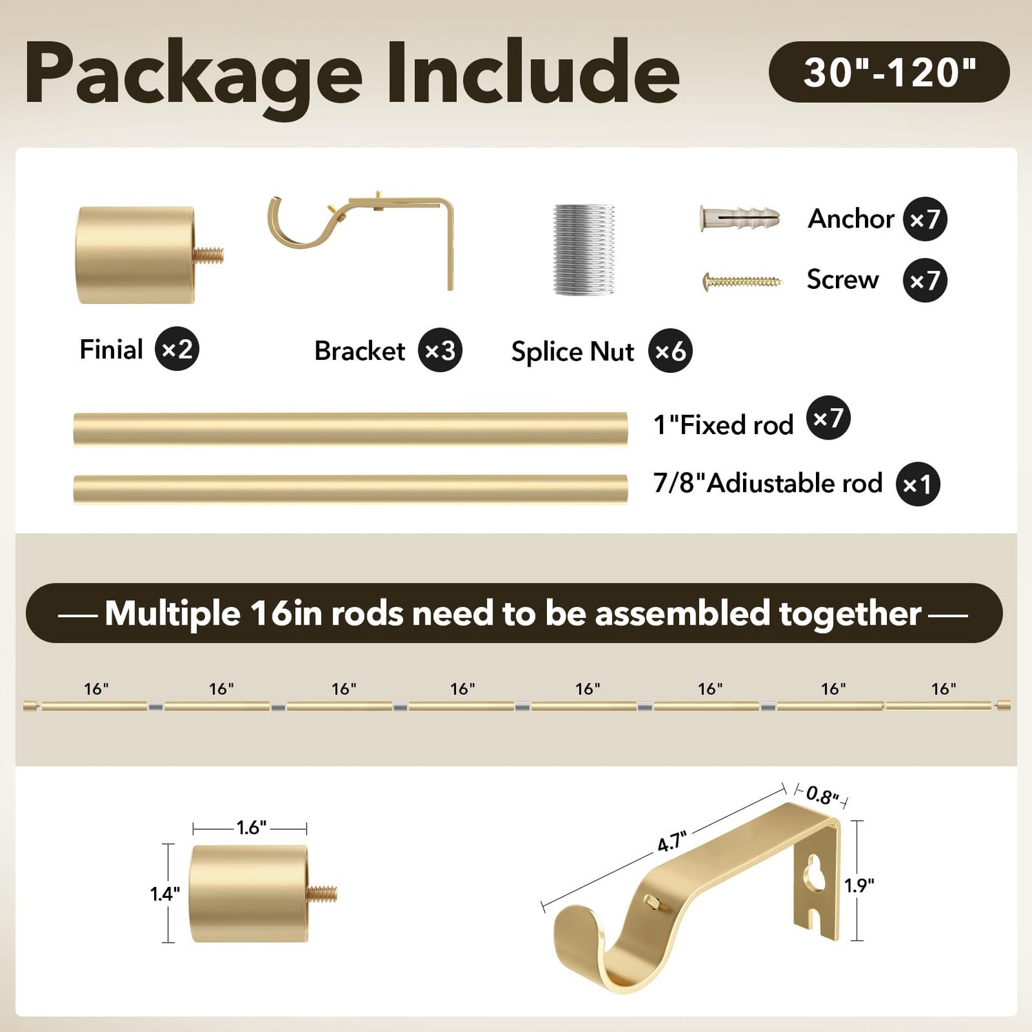 - 【Gold Curtain Rods Package Include】Gold curtain rods for windows 66 to 120 inch include 1 adjustable 7/8" rod, 7 fixed 1" rod, 2 finials, 3 brackets, 7 drywall anchors, 7 screws, 6 splice nuts and installation instruction.
