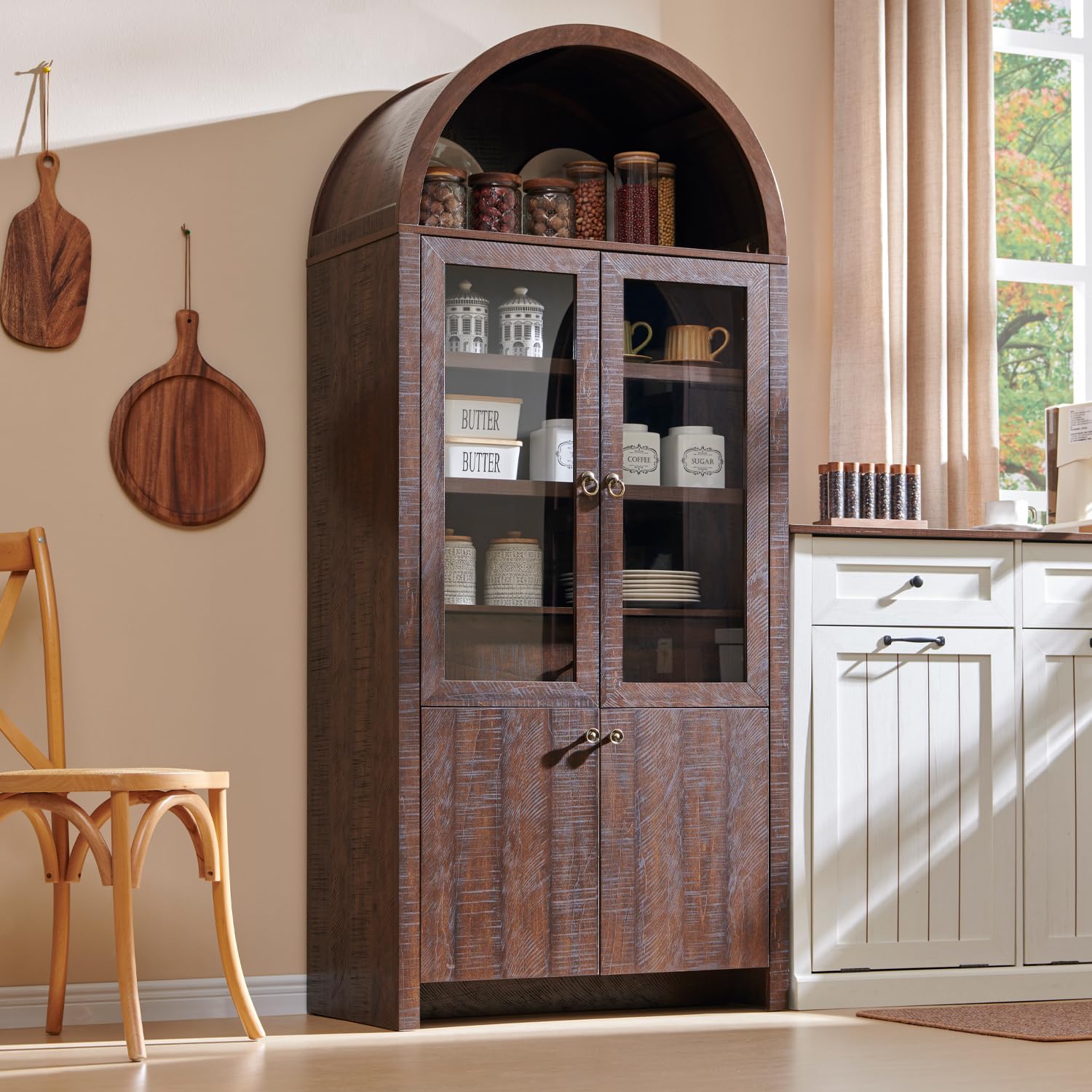 - STYLISH ARCH DESIGN: Tall arched china cabinet is a stunning blend of design and practicality. The gracefully arched silhouette serves as a statement piece, infusing your kitchen with modern elegance. The open arched shelves complement the design, offering both visual appeal and easy access to essentials. Paired with two glass doors, which add a refined touch by showcasing your chinese, this cabinet is as much about style as it is about functionality, making it a perfect addition to kitchen
