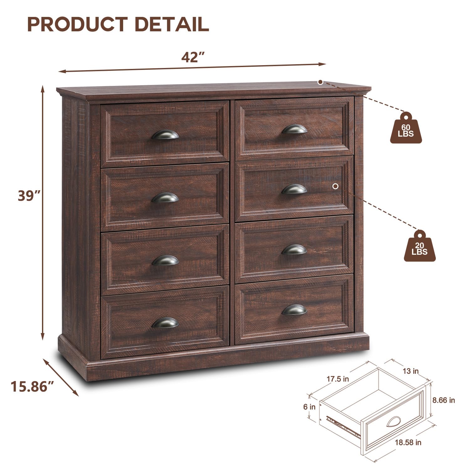- Farmhouse Style: Farmhouse wooden 8 drawer dresser featuring 8 Standard drawers. The light rustic oak lacquer finish paired with the wood top combines vintage elements to add character and charm to your bedroom and living room. It's a simple and striking combination for those who love farmhouse style. The bedroom dresser is made of durable engineered wood for long-term use, scratch resistant. No strong odor. The widened dresser legs made the dresser not slide easily, providing great durability and stability.