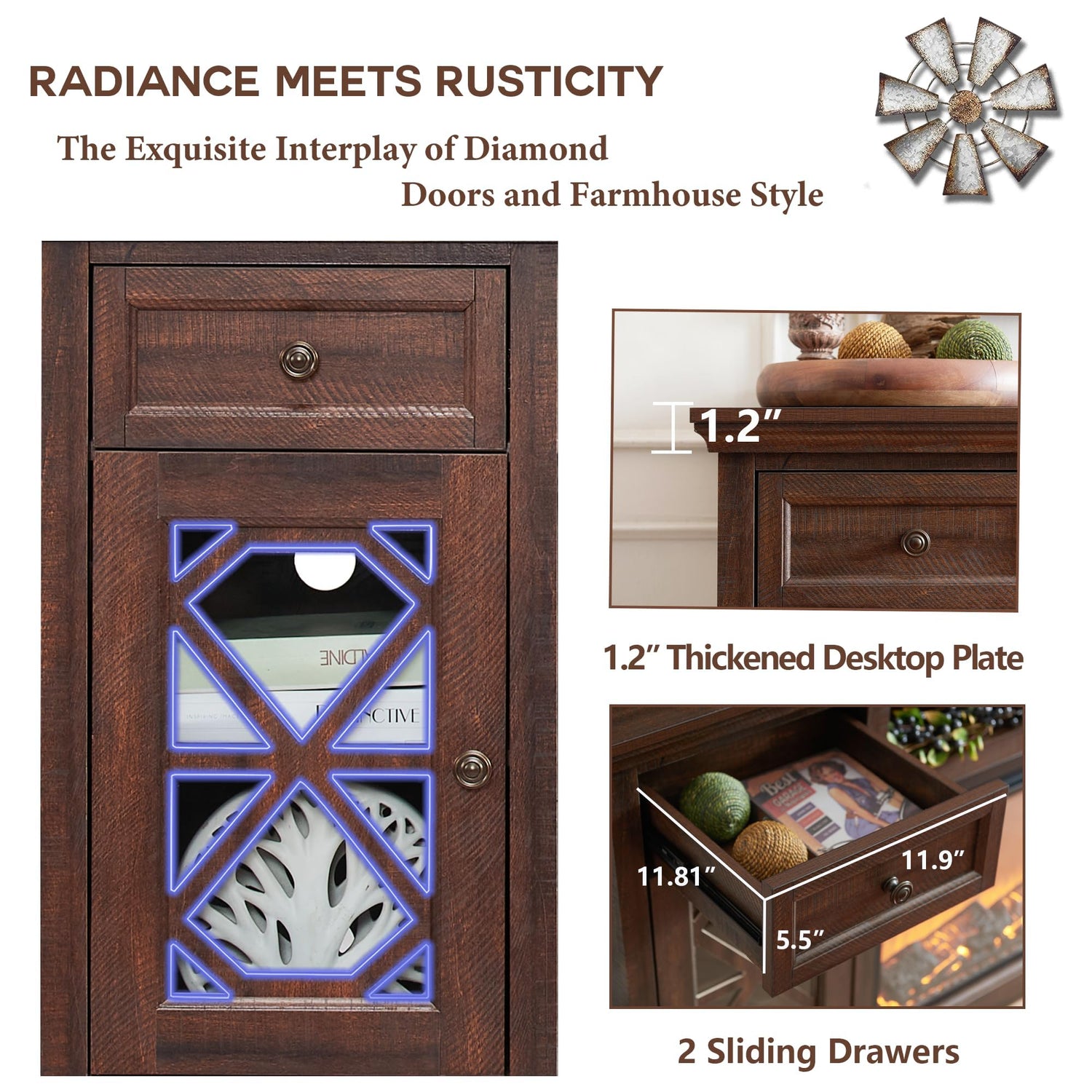 - Farmhouse Classic Design: Embrace rustic charm and sophistication with farmhouse-inspired fireplace TV stand featuring diamond panel doors. This exquisite design merges timeless elegance with the cozy warmth of a 36-inch large screen fireplace. Whether your space boasts a classic, contemporary, or eclectic vibe, our fireplace TV stand becomes a harmonious addition that elevates your decor.
