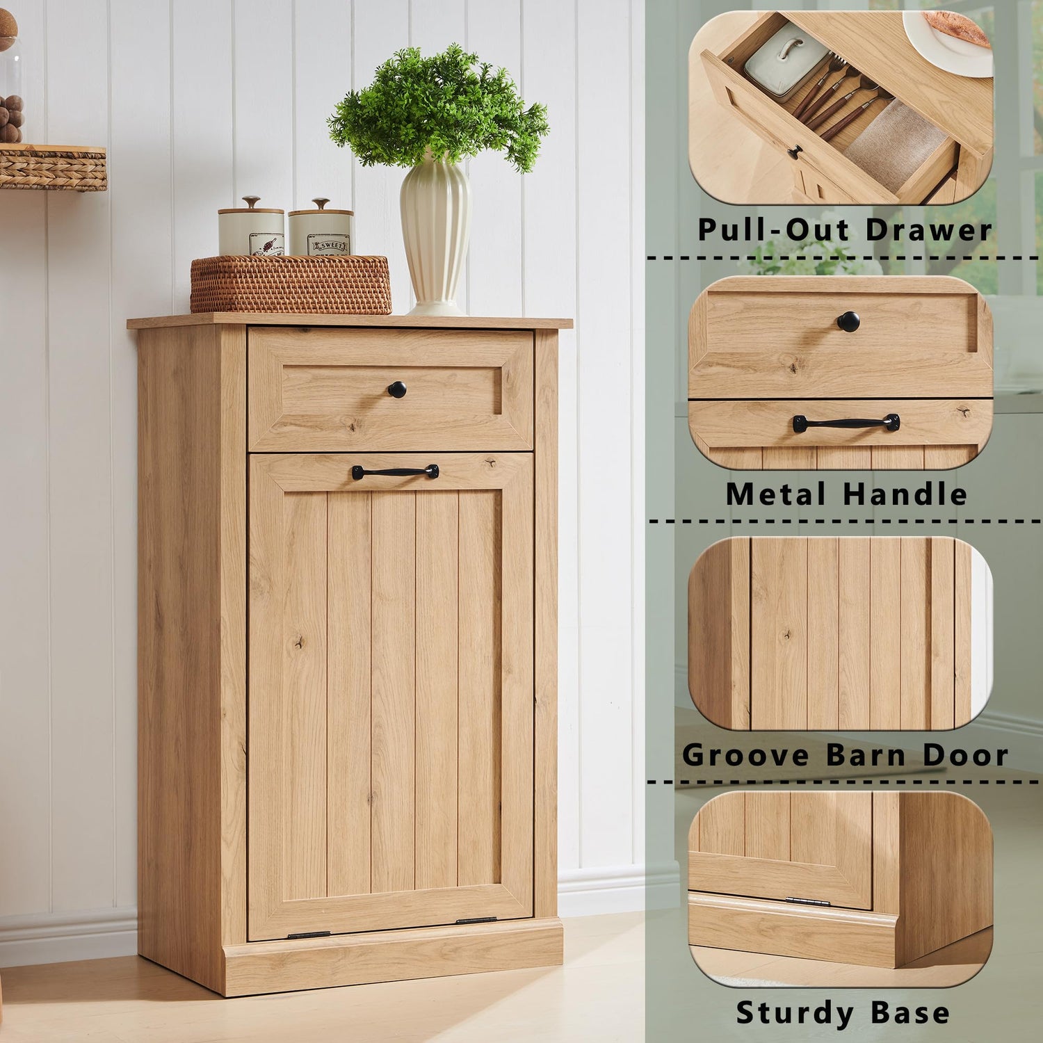 - 【Space Saving & Hidden Design】This tilt out trash cabinet hides the trash can well, ensuring that your kitchen is sophisticated as well as your floors are clean and tidy, and the hidden design prevents odors from overflowing, so pets will never knock over the trash can again, keeping you happy throughout the day.