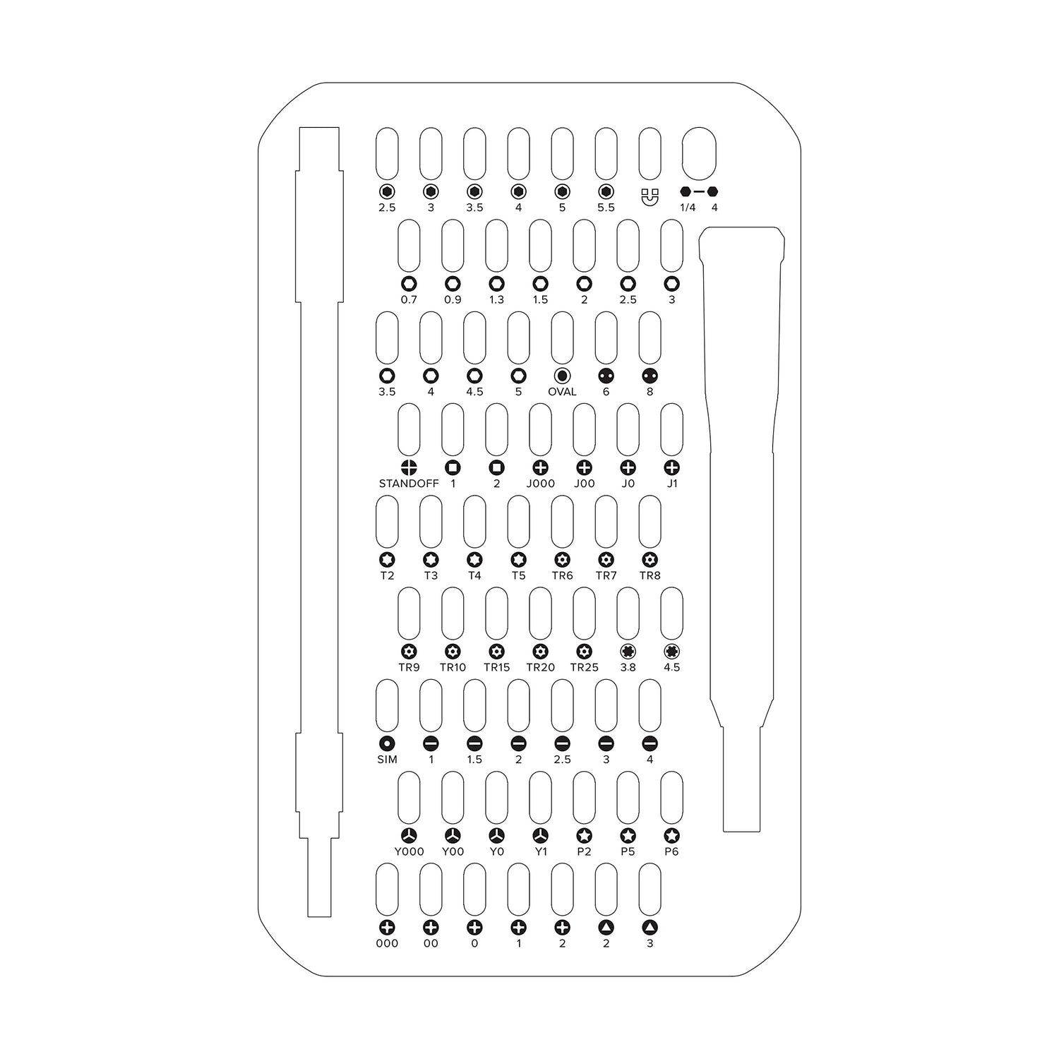 Details: The Make Driver Kit includes iFixit's 4 mm aluminum screwdriver handle with magnetic bit sockets, knurled grips, and swivel tops "plus 64 precision driver bits and a flexible extension. We built this 64 bit driver kit using data from thousands of our repair manuals and teardowns, ensuring you have the most compact yet complete assortment of bits for electronics repair. This driver kit includes standard, security, and specialty driver bits for a wide range of regular and exotic repairs. Standard bits like Phillips and Flathead will get you into most small household appliances and electronic devices. And security and exotic bits like pentalobes will let you gain access to your Apple devices like iPhones and MacBooks. Whether you're a professional fixer or a weekend warrior, this bit kit has what you need to disassemble, repair, and reassemble smartphones, game consoles, wearables, laptops, desktops, tablets, small appliances, and much more! All our next-gen bit kits have been re-engineered for maximum utility. The bit kit lid is held in place with magnets to increase product lifespan (no more broken hinges or clasps) and also mounts to the back of the bit kit case to keep it out of the way while you do your work. Or, if you need help keeping your screws and parts organized, use the lids integrated sorting tray. And our 4 mm bits have been redesigned with a longer neck for a deeper and more precise reach. Kit Includes: Easy-to-Open Magnetized CaseLid with Built-in Sorting Tray150 mm Flex Extension4 mm Aluminum Bit Driver 4 mm Screwdriver Bits Phillips - 000, 00, 0, 1, 2Flathead - 1, 1. 5, 2, 2. 5, 3, 4 - T2, T3, T4, T5Torx Security - TR6, TR7, TR8, TR9, TR10, TR15, TR20, TR25Pentalobe - P2, P5, P6JIS - J000, J00, J0, J1Hex - 0. 7, 0. 9, 1. 3, 1. 5, 2, 2. 5, 3, 3. 5, 4, 4. 5, 5 -point - Y000, Y00, Y0, Y1<