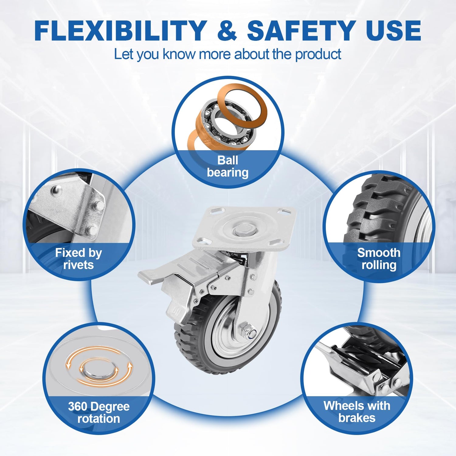 - 【Heavy Duty 6" Caster Wheels】 These 6 Inch heavy duty casters are constructed with robust solid galvanized iron bracket and premium polyurethane (PU) wheels, wear-resistant, reduce noise, longer service life, anti-slip and shock absorption, easily support up to 440 lbs per wheel. Suitable for all kinds of road conditions.