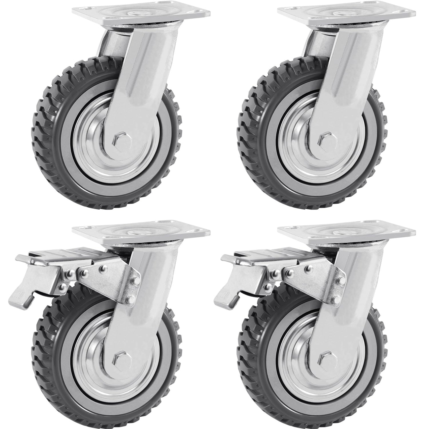 - 【Package Included】 2Pcs caster wheels with brake + 2Pcs without brake. Wheel diameter: 6"/150mm; Wheel Width: 2"/50mm; Top Plate Size: 4x4.5" / 100x115mm; Overall height(from top plate to ground): 7"/180mm