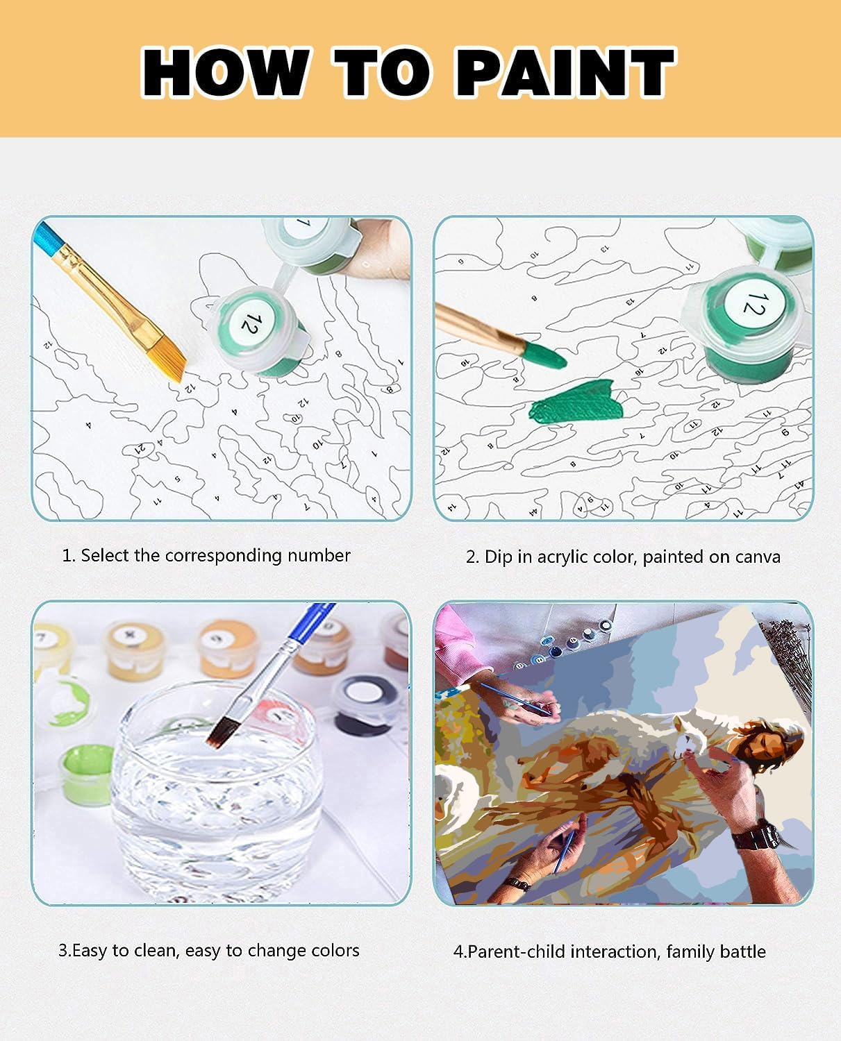 - Easy Paint by Numbers Kit for Adults: Jesus paint by numbers for adults canvas comes with everything you need. The paint by number kit includes 1 pre-printed canvas (no frame), 1 acrylic paint set, 3 quality brushes, 1 color postcard guide, 1 paper numbered canvas reference, 2 metal hooks.