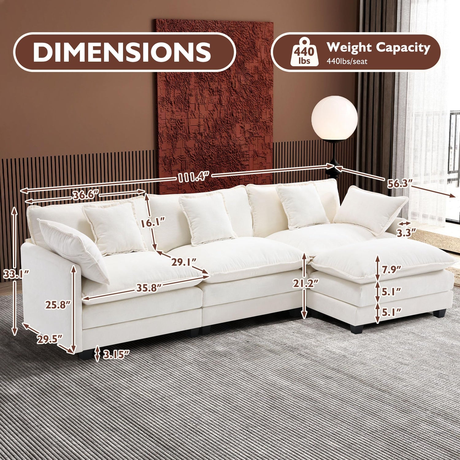 - Four Boxes Packaging & Easy Assembly: We put all the parts in four boxes for easy transport, you can install it in 30 minutes by using the included detailed instructions. Overall dimensions: 56.3"D*111.4 "W*33.1 "H; Ottoman dimensions: 22.8 "D*37"W*21.2 "H.