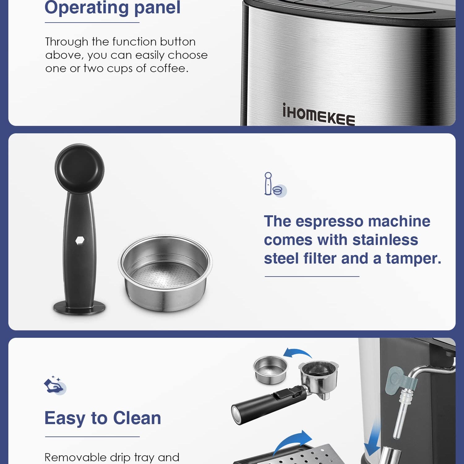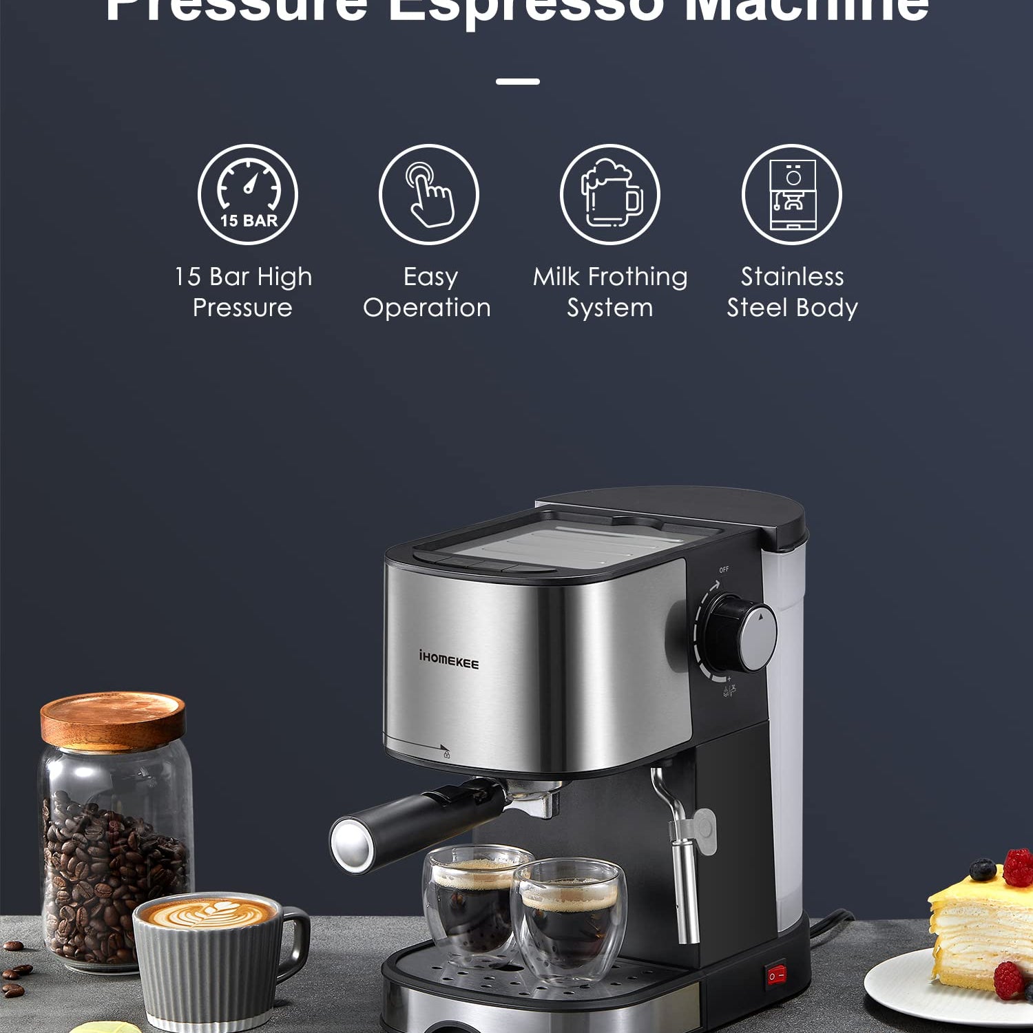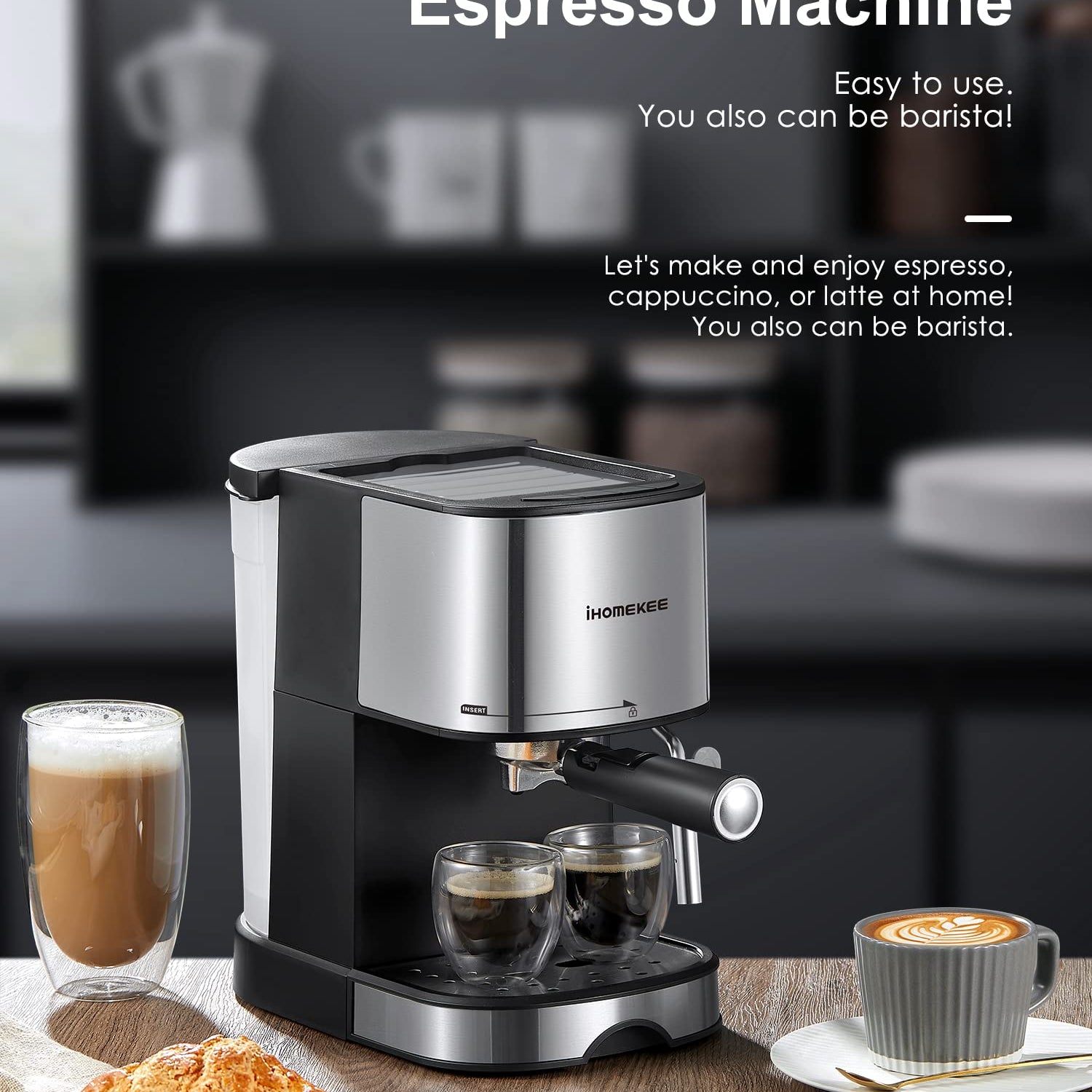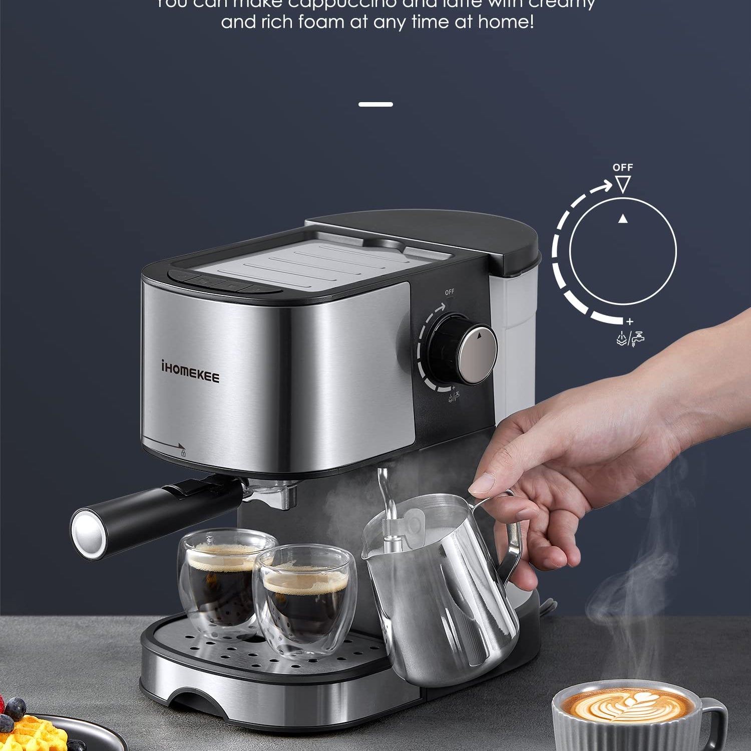 Ihomekee Espresso Machine, Espresso and Cappuccino Coffee Maker with Milk Frother/Steam Wand for Latte, Mocha, Cappuccino, 15 Bar Pump Pressure Semi-Automatic Coffee Machine, Silver+Black