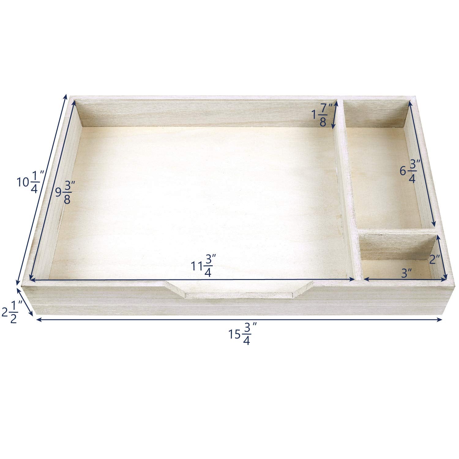 Overall: 16 1/2"W x10 1/4"D x 5 1/8"H; Drawer compartments: 11 34”W x 9 3/8”D x 1 7/8”H, 3”W x 2”D x 1 7/8”H and 3”W x 6 3/4”D x 1 7/8”H