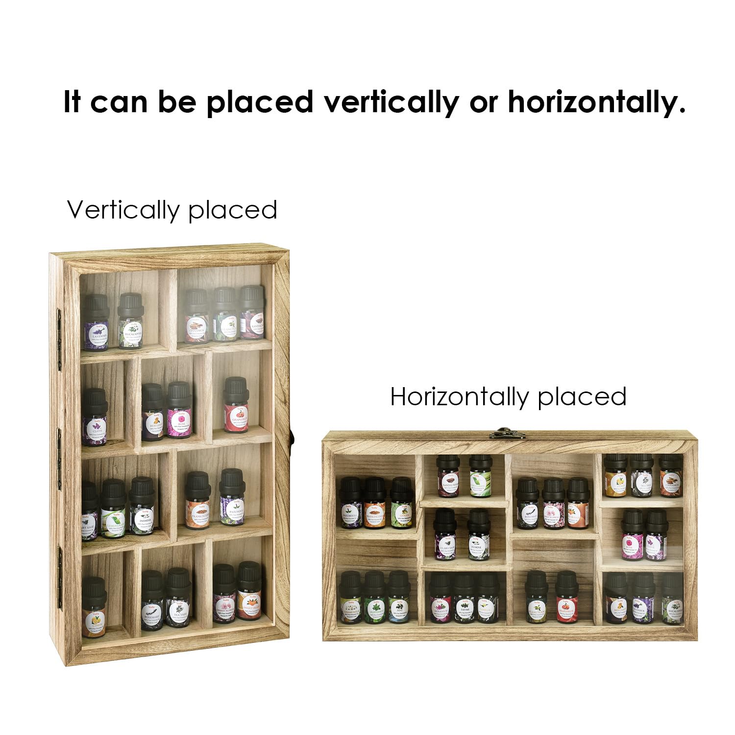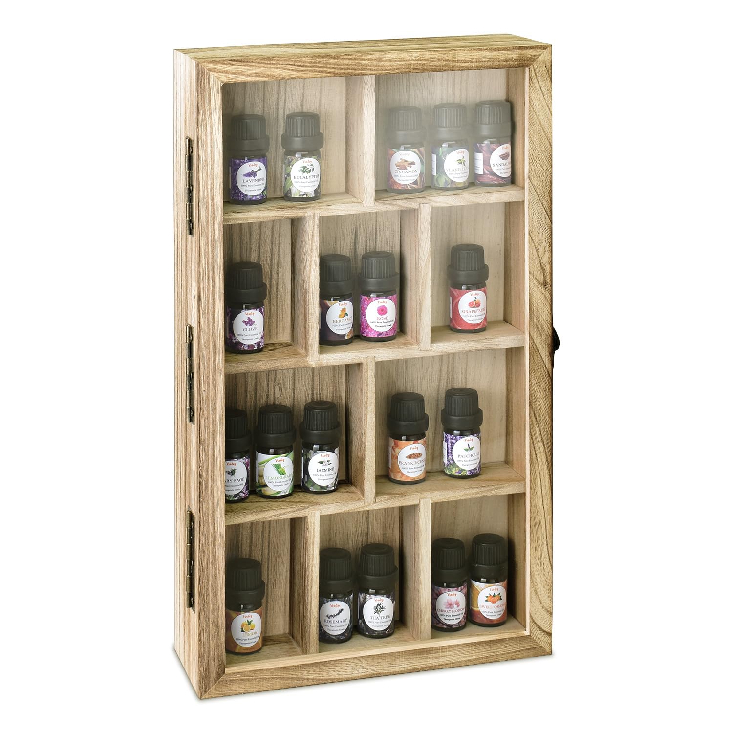 Ikee Design Wooden Collection Display Case with Hinged and Clear Tempered Glass Top, Wall Mounted 10 Slots Wood Display Storage Box for Mini Figures, Collections, Essential Oils, Oak Color