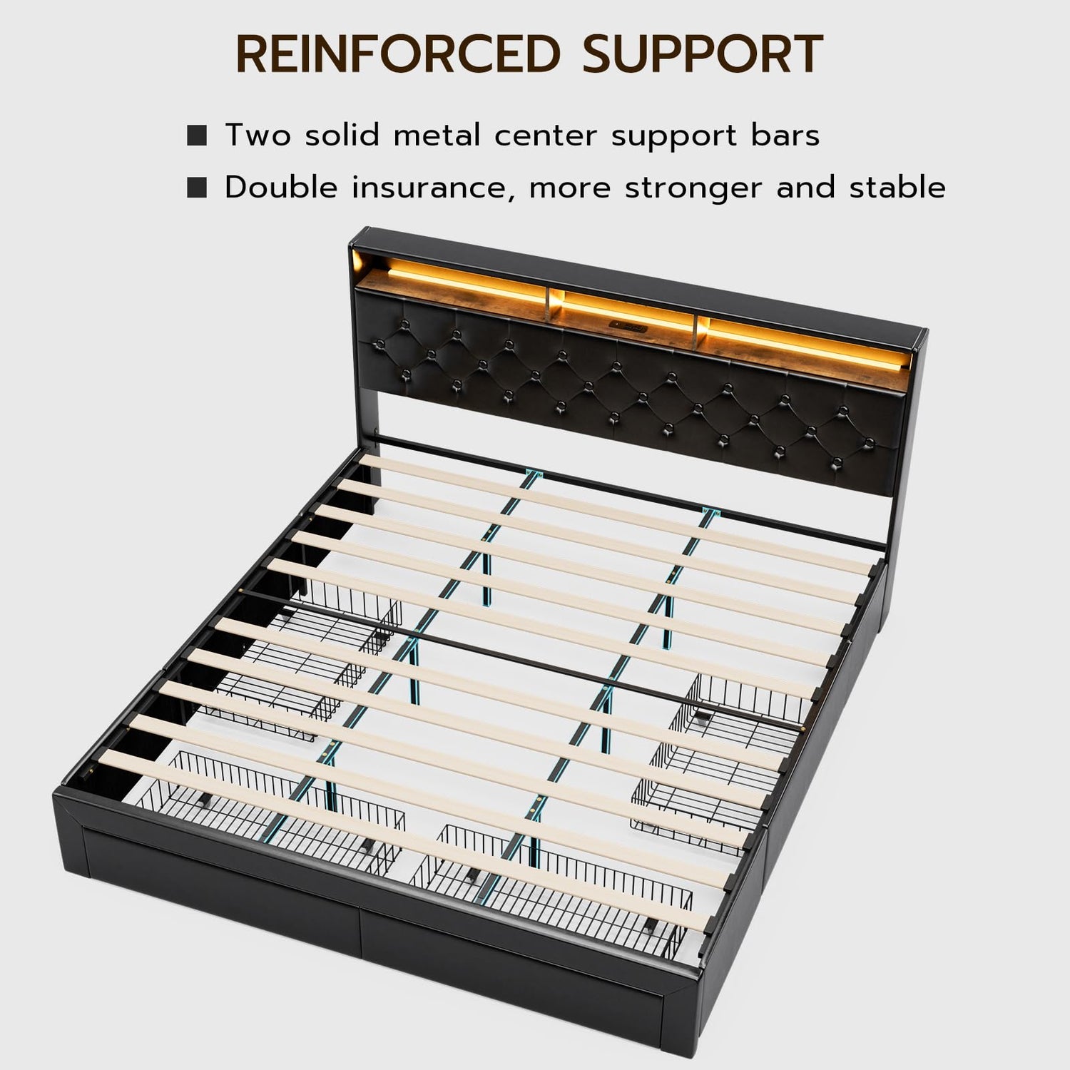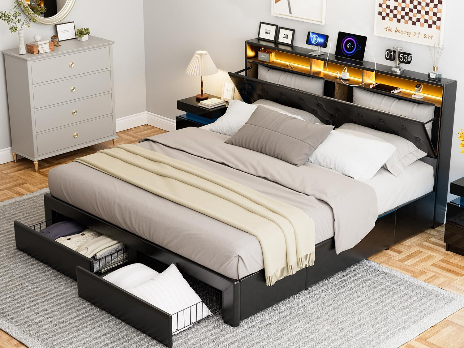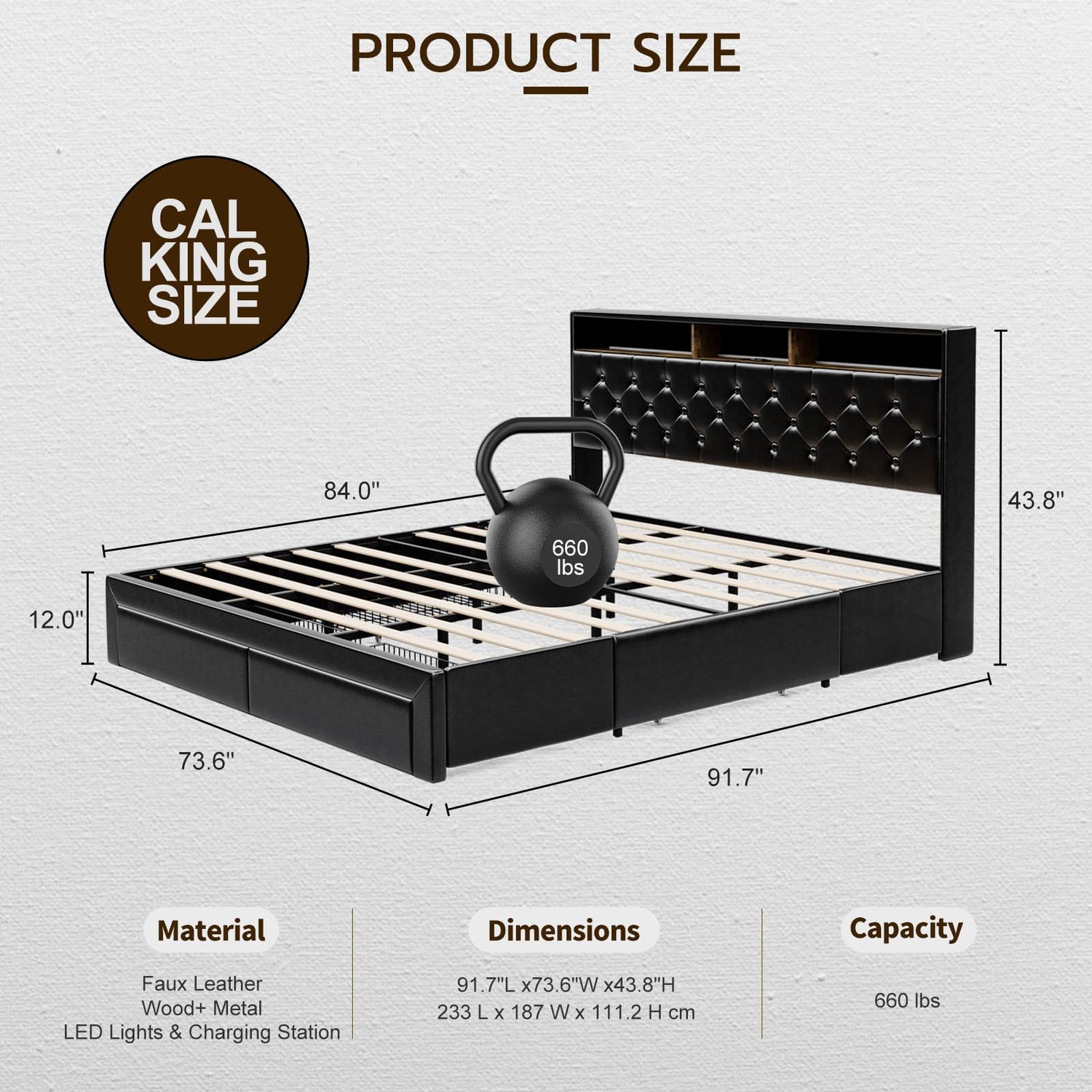 IKIFLY California King Bed Frame with Storage Drawers and LED Headboard, No Box Spring Required, Black