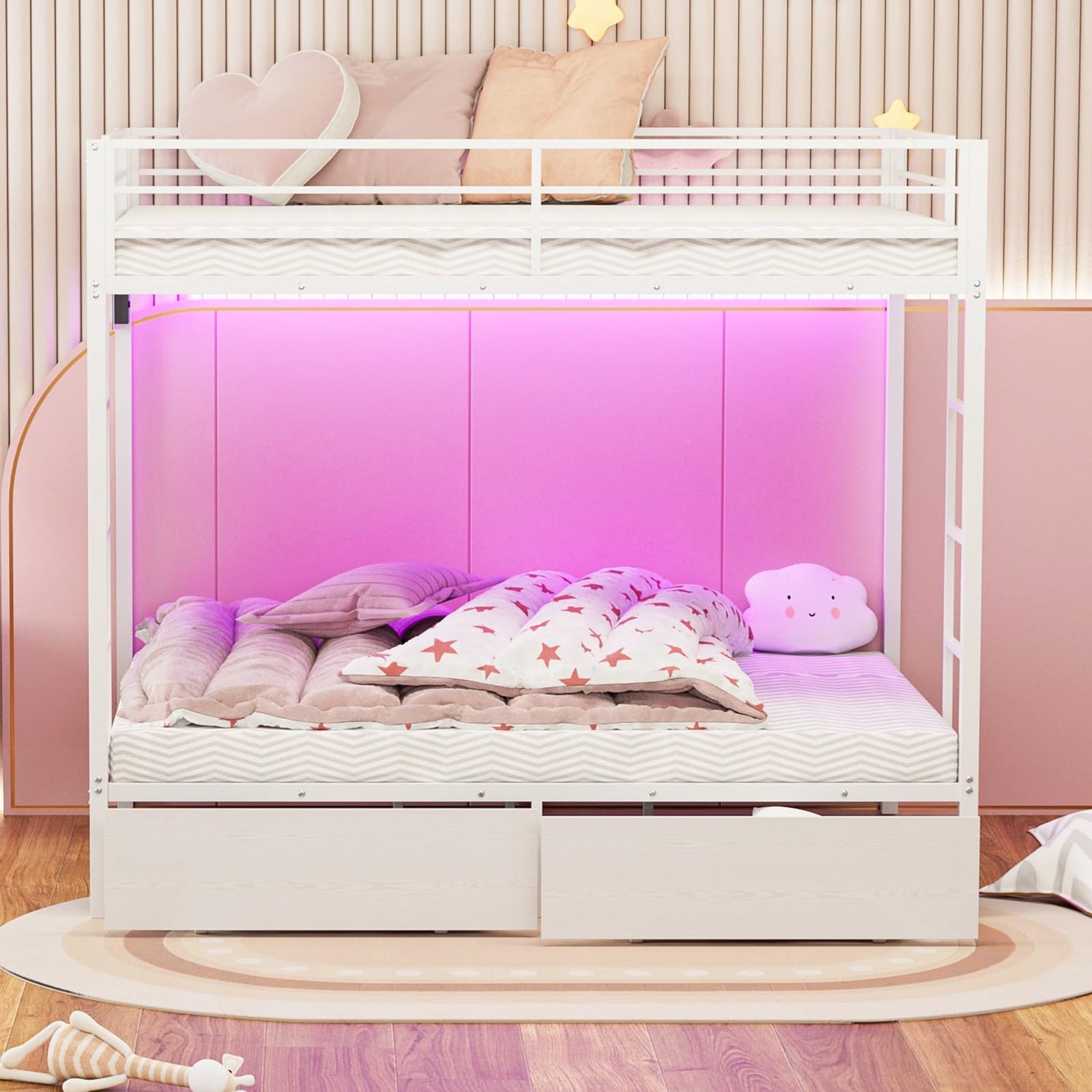 IKIFLY Full Over Full Bunk Beds with 2 Storage Drawers, Heavy Duty Metal Bunk Bed with LED Lights and Charging Station, Safety Guardrail & 2 Ladders, Space-Saving, No Box Spring Needed, White