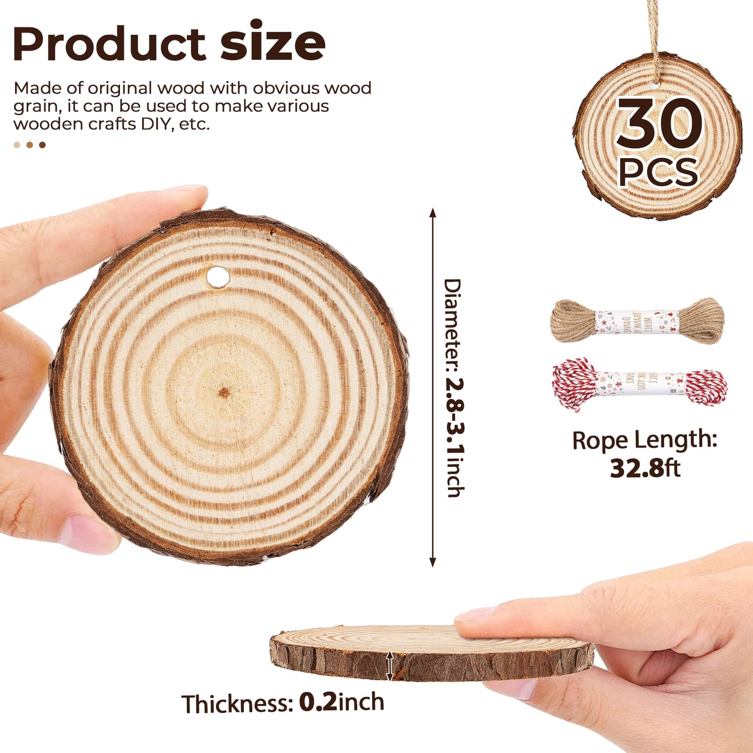 ilauke Wood Slices, 30 Pcs 2.7"-3.1" Natural Wood Slices with Predrilled Hole, Unfinished Wood with Bark, Wooden Circles for Crafts and Paint DIY Ornaments Christmas Crafts Arts Wedding Decor
