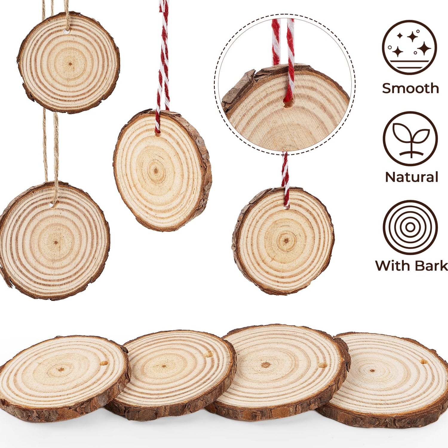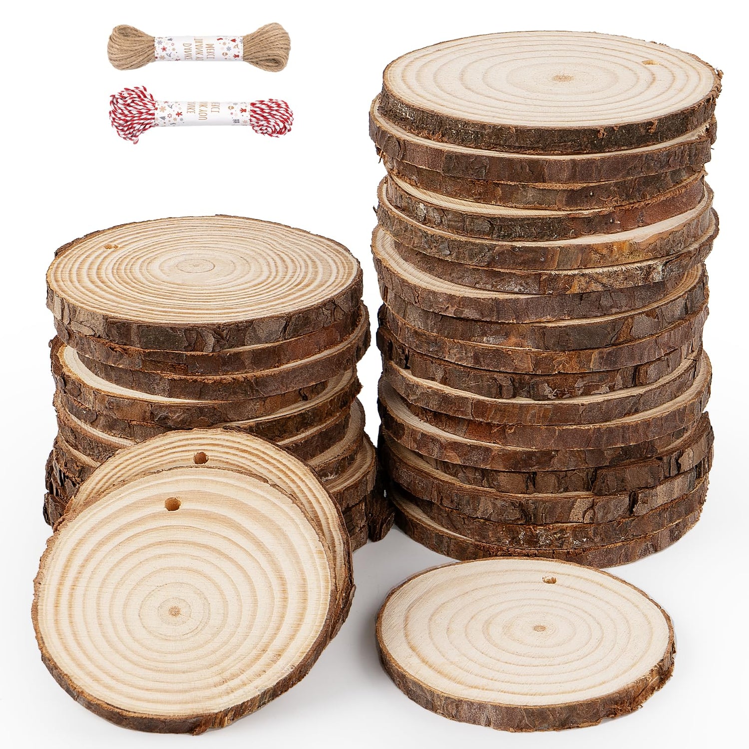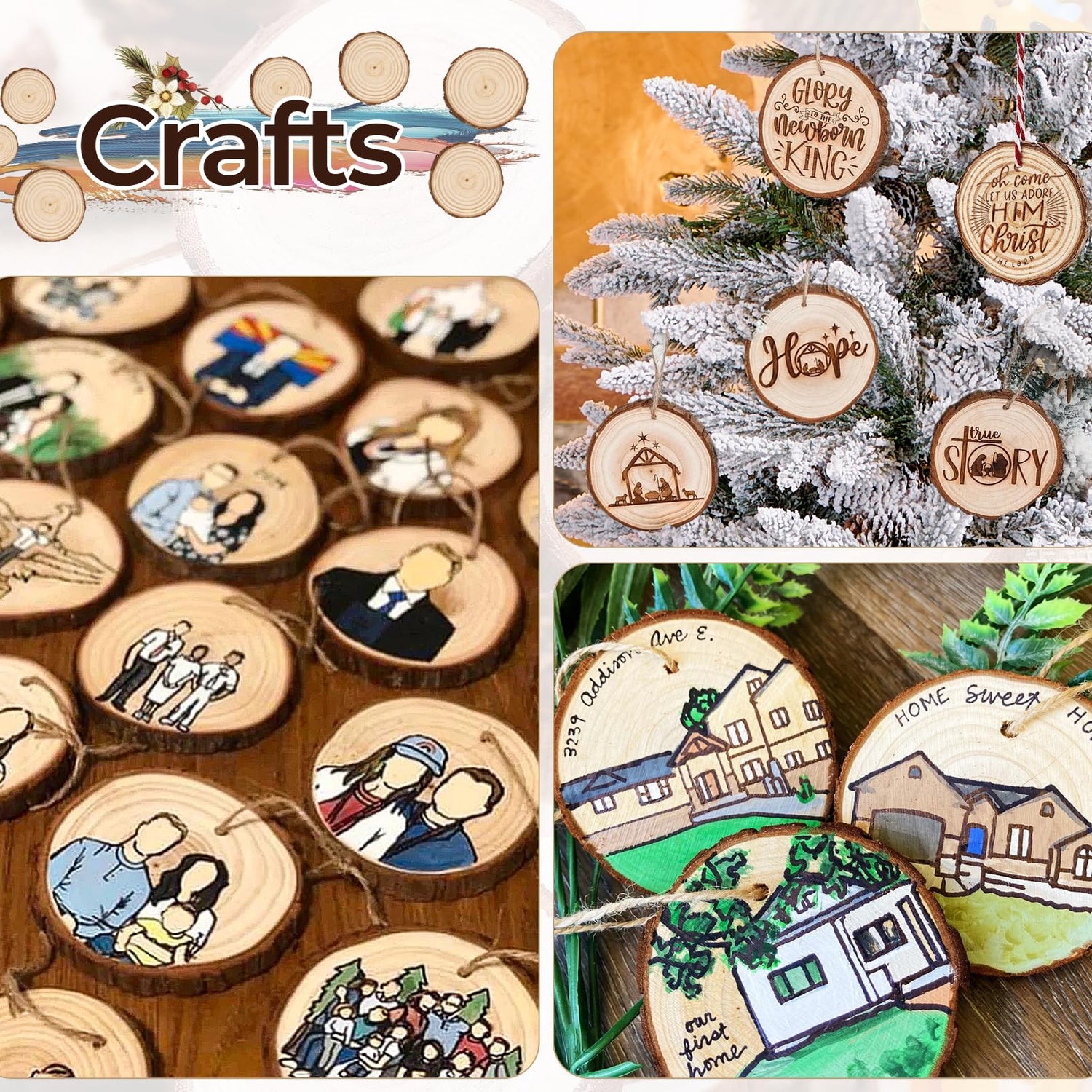 - Widly & Easy to Use: With a rustic and natural beauty look, these round wooden discs retain the bark, wood grain and growth rings.Great for DIY craft, easy to write, paint and draw, can be use wood coasters, wall art decorations, wedding and home diy ornaments, and can make Christmas decoration hanging signs.