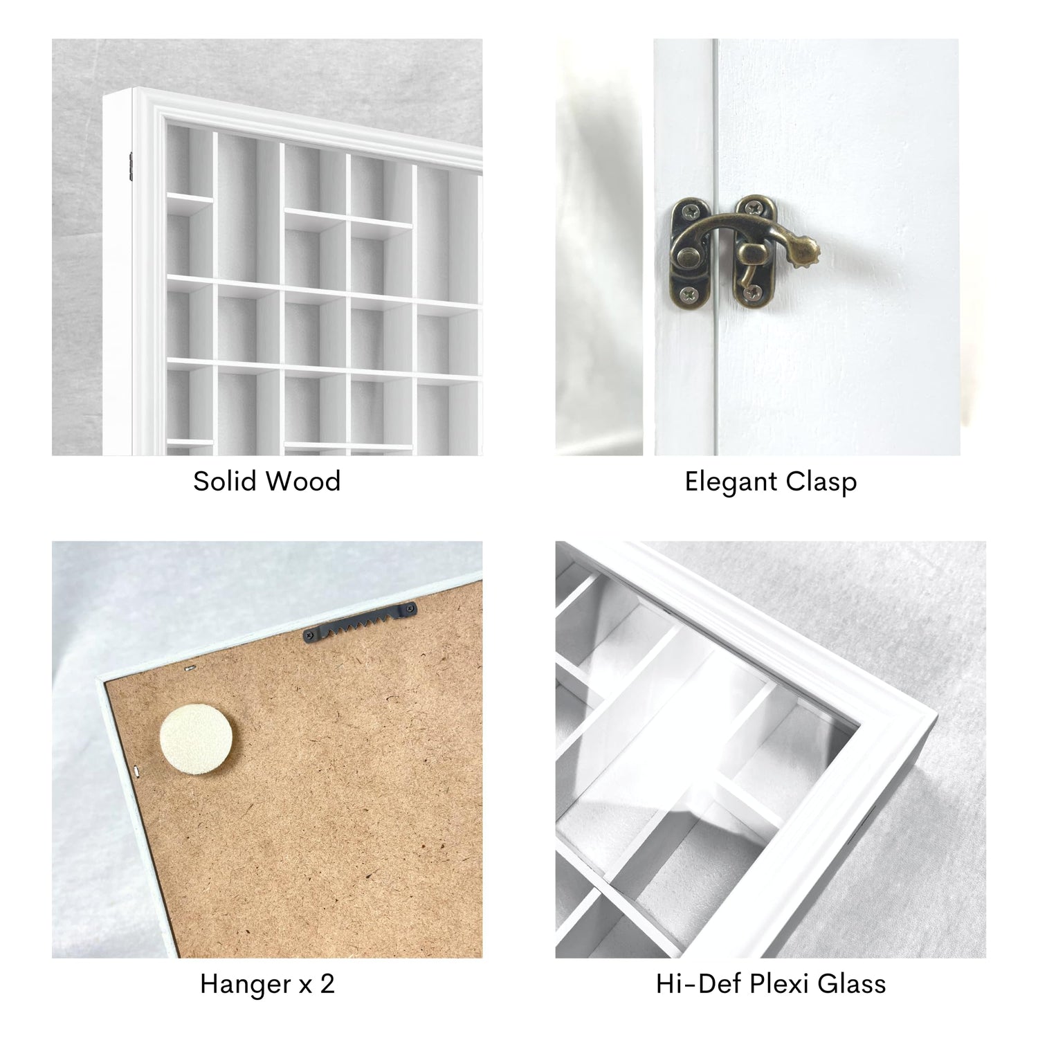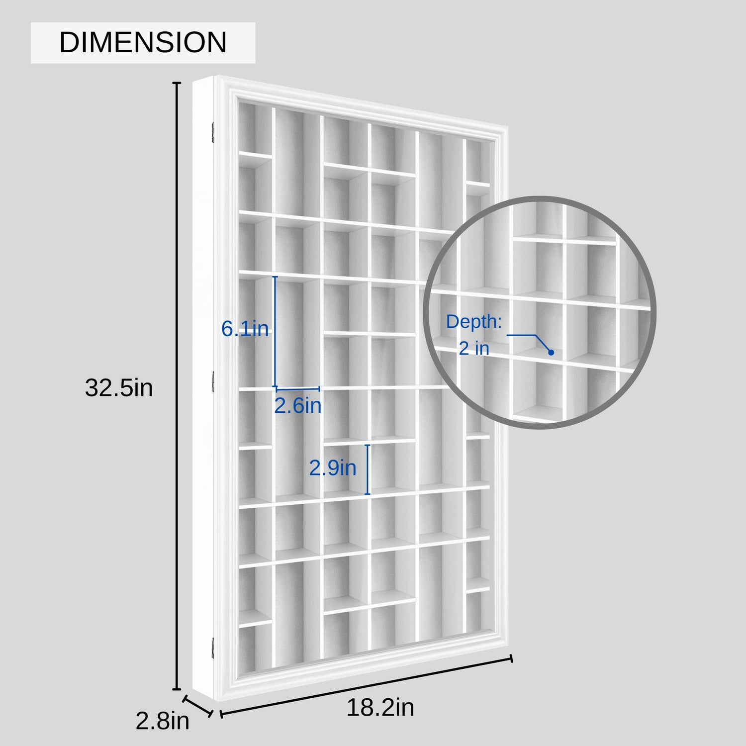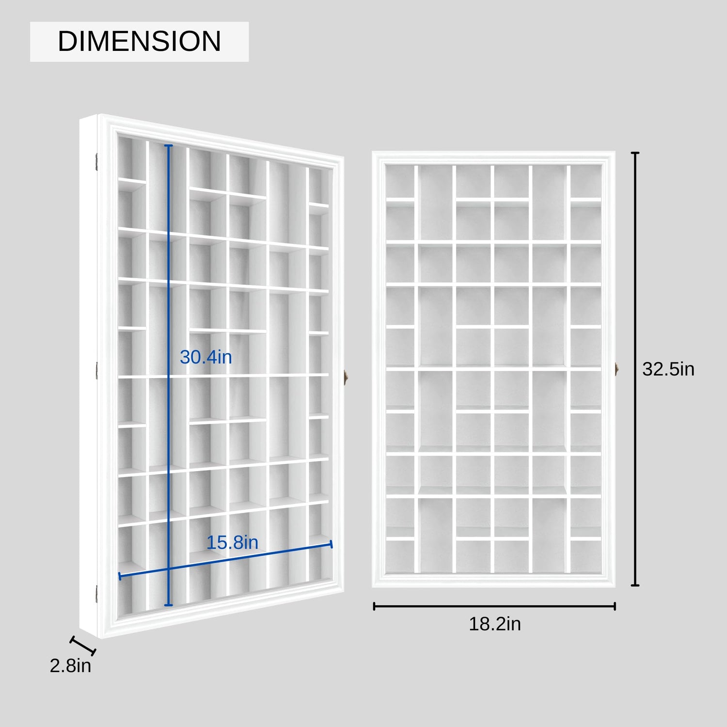 - SIZE --- 17” x 32” divided wall display cabinet with 52 slots. COLOR - White