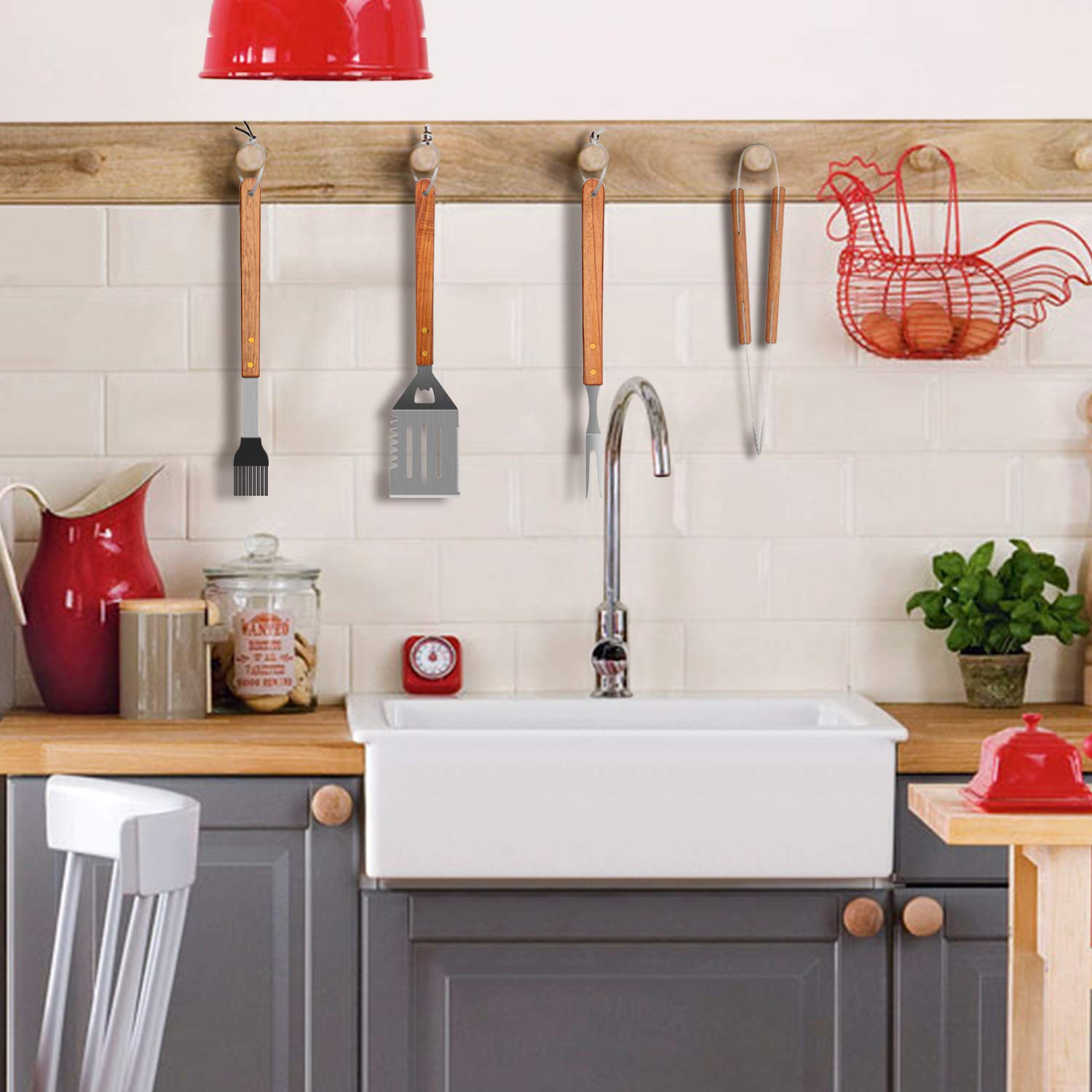 - USER-FRIENDLY DESIGN: It can be seen that some of the grilling tools has some outstanding features. For instance, a multifunctional spatula has a 2 in 1 design, one is used for cutting meat with its sharp serrated edge, the other is used as a bottle opener. There is a wood handle design of chopper in order to grip easily and comfortably.