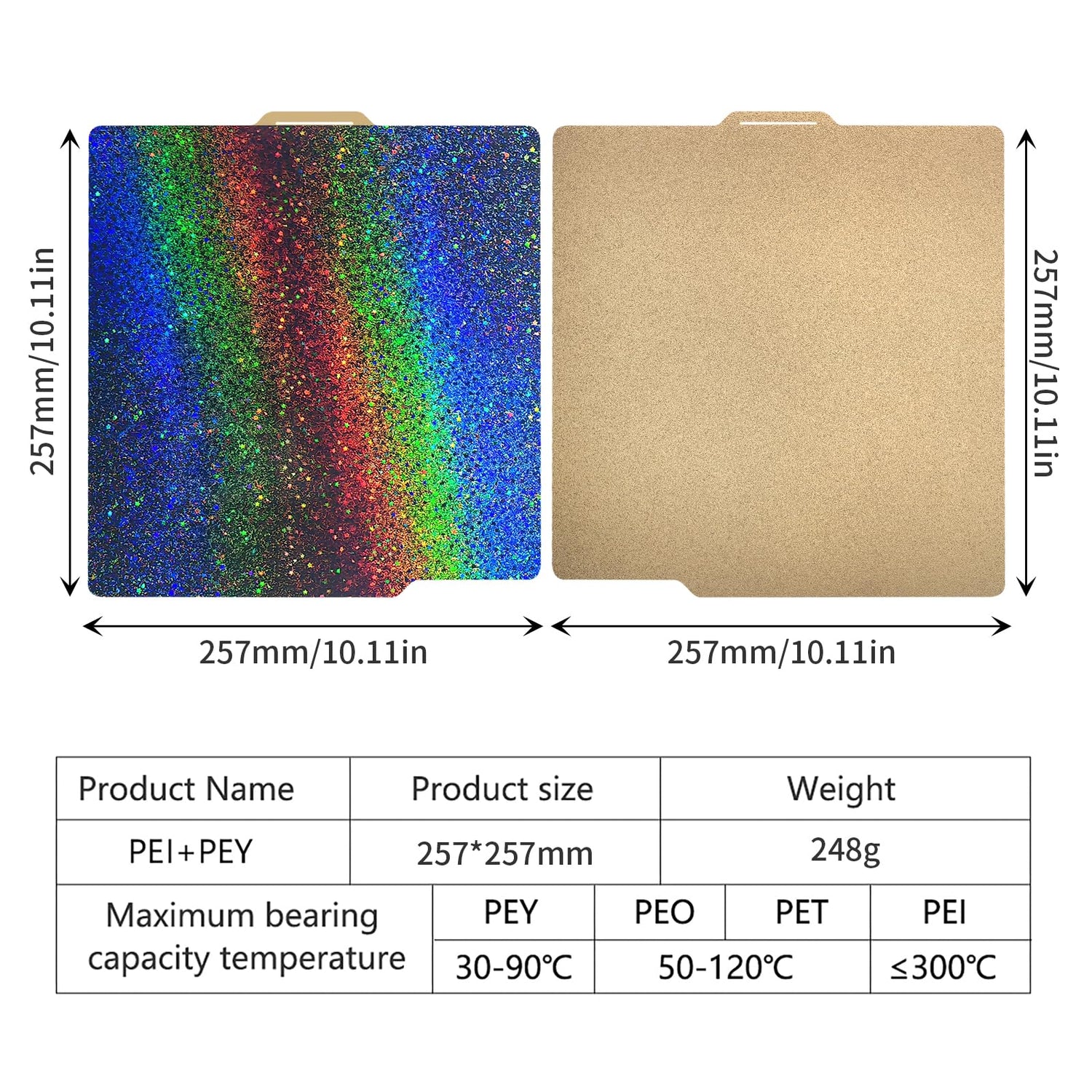 - 3. Support various filament printing: After our extensive testing, we recommend the PEY layer to print ABS/TPU/ PETG. (temperature suggestion: 50°C-70°C, ≤90°C). The PEI layer print PLA/ PLA-CF/ PETG/ PC/ ABS/ TPU/ Nylon etc. NOTE: Do not print Pla by the PEY side please.