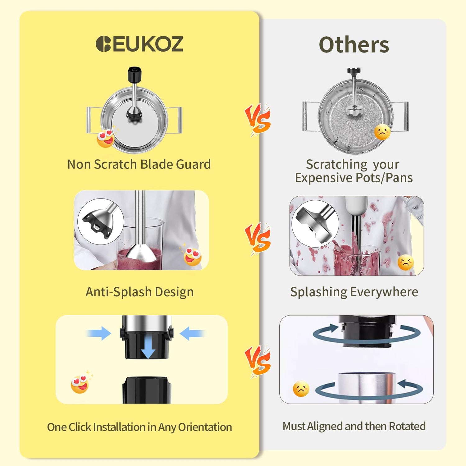 - Non Scratch Feature: Immersion blenders for kitchen,which Anti-scratch,Anti-splash Semi-wrapped blade guard designed for protecting your container,preventing splashing and keeping food from getting stuck.the sharp stainless steel blending blade guard design specifically protects non-stick cookware, scratch resistance blade guard allow you to blend directly in deep pots or pans without scratching them,choose any of your pots or pans, don't worry about scratching them.CEUKOZ upgraded 4-leaf titanium, other 2 leaf only