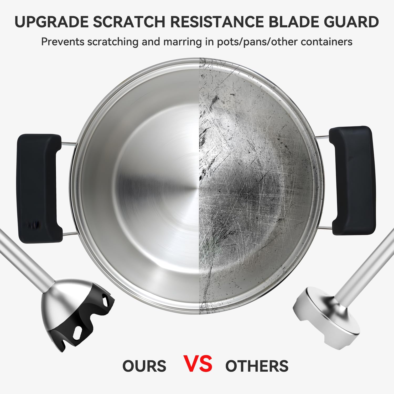 - THOUGHTFUL SCRATCH RESISTANT FEATURE & SAFE: The upgraded hand blender scratch-resistant blade guard design specifically protects non-stick cookware, allowing you to choose any of your pots or pans and no more worry about scratching them. The hand mixer electric handheld combo is made of BPA-free plastic and 304 stainless steel which is safe, healthy and long lasting.