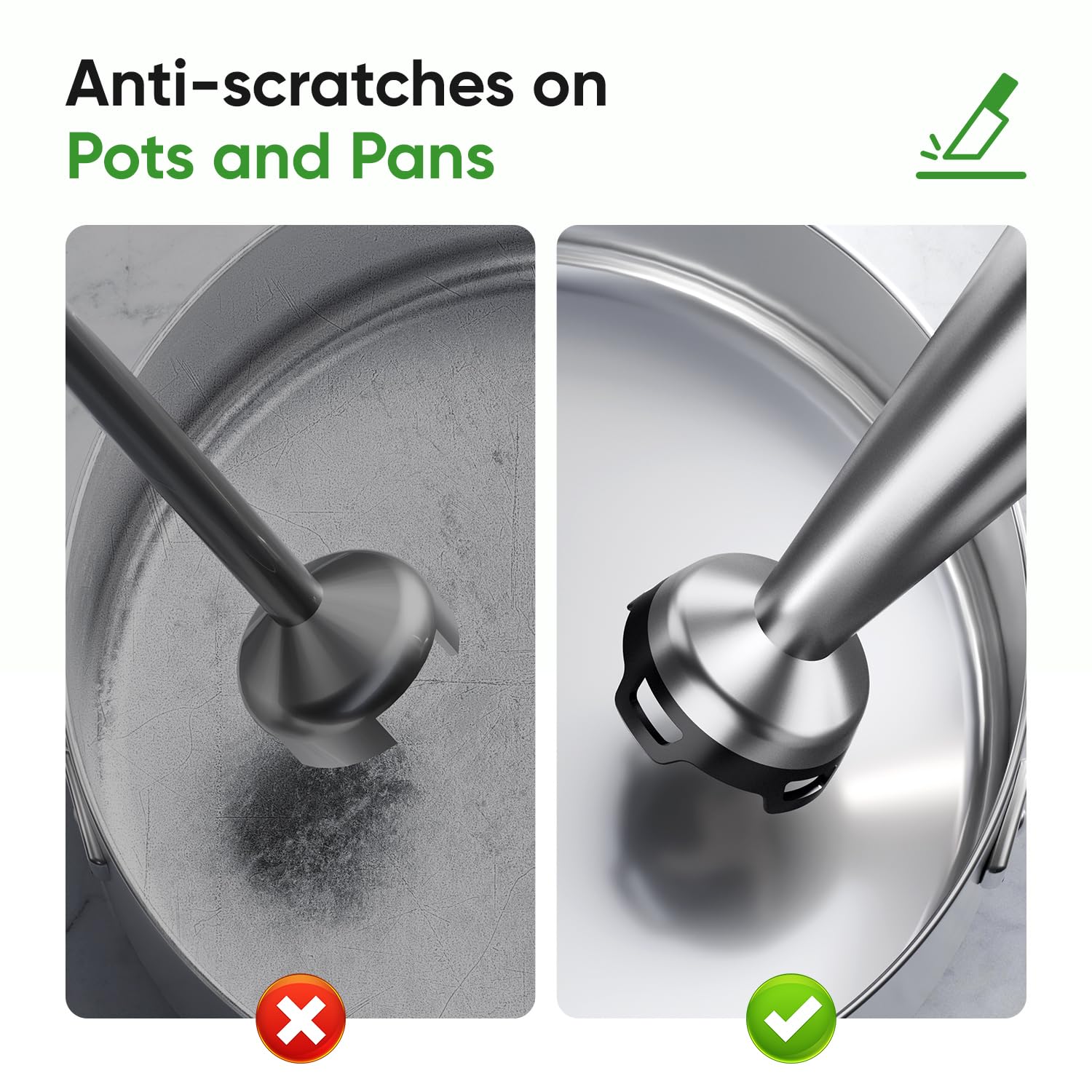 - Protect Your Cookware: This immersion blender handheld has a bell shaped base and food-grade nylon blade guard to protect your pots and pans from scratches and extend the life of kitchen tools. It also can prevents splatter to keep your clothes and kitchen clean