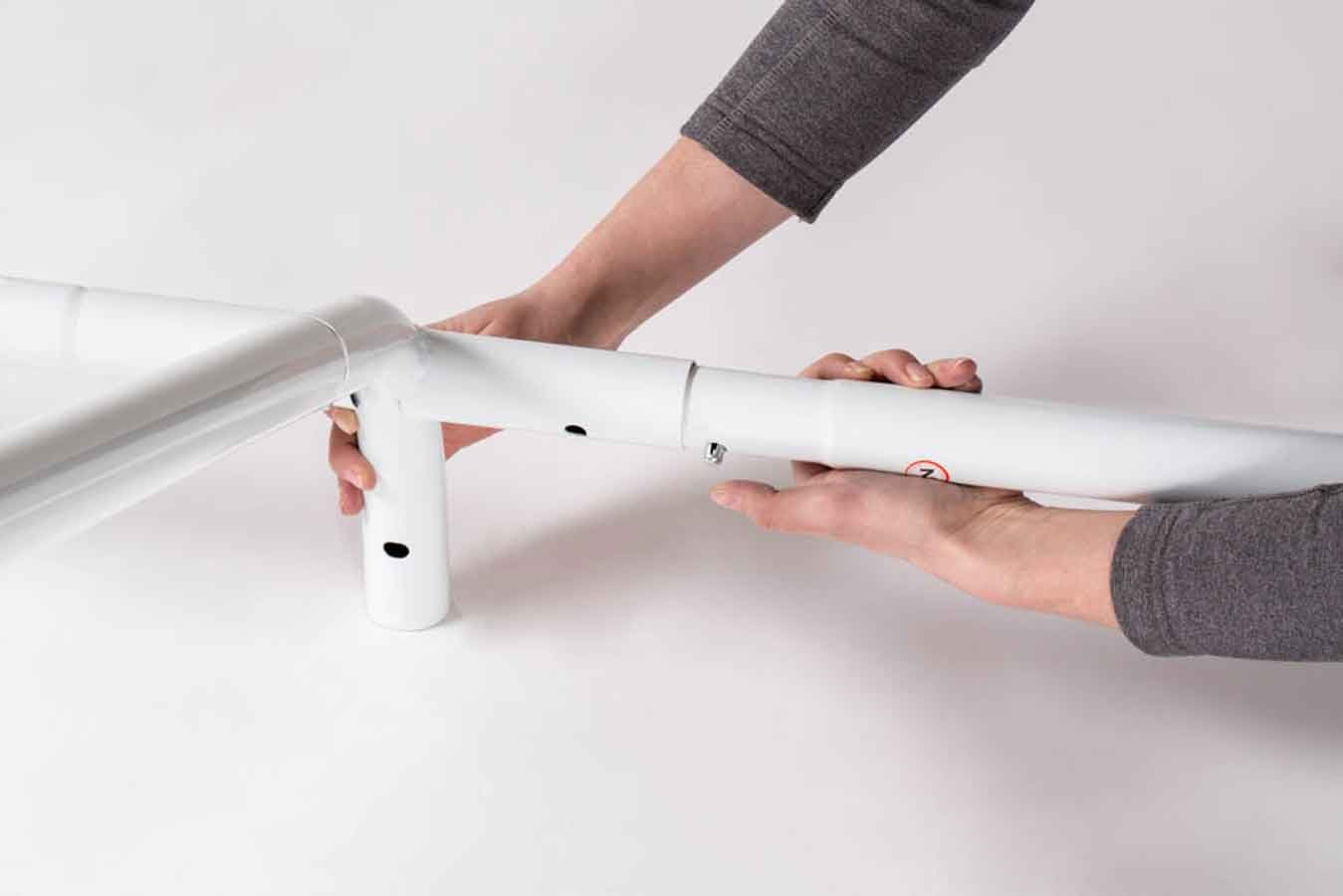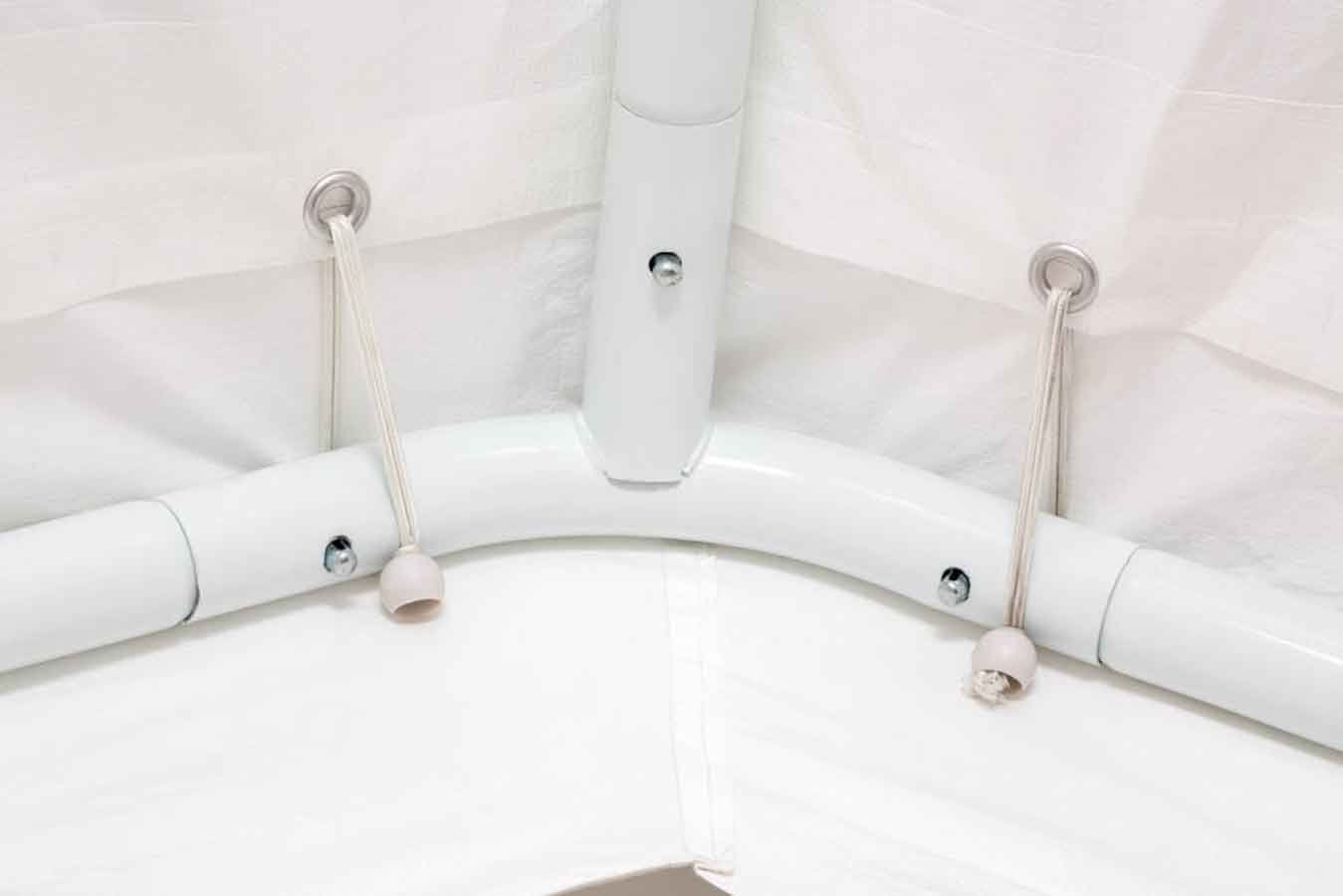 - INCLUDES: Canopy with dressed legs, steel frame with 8 legs, fitted leg skirts, metal footpads, and ball bungees