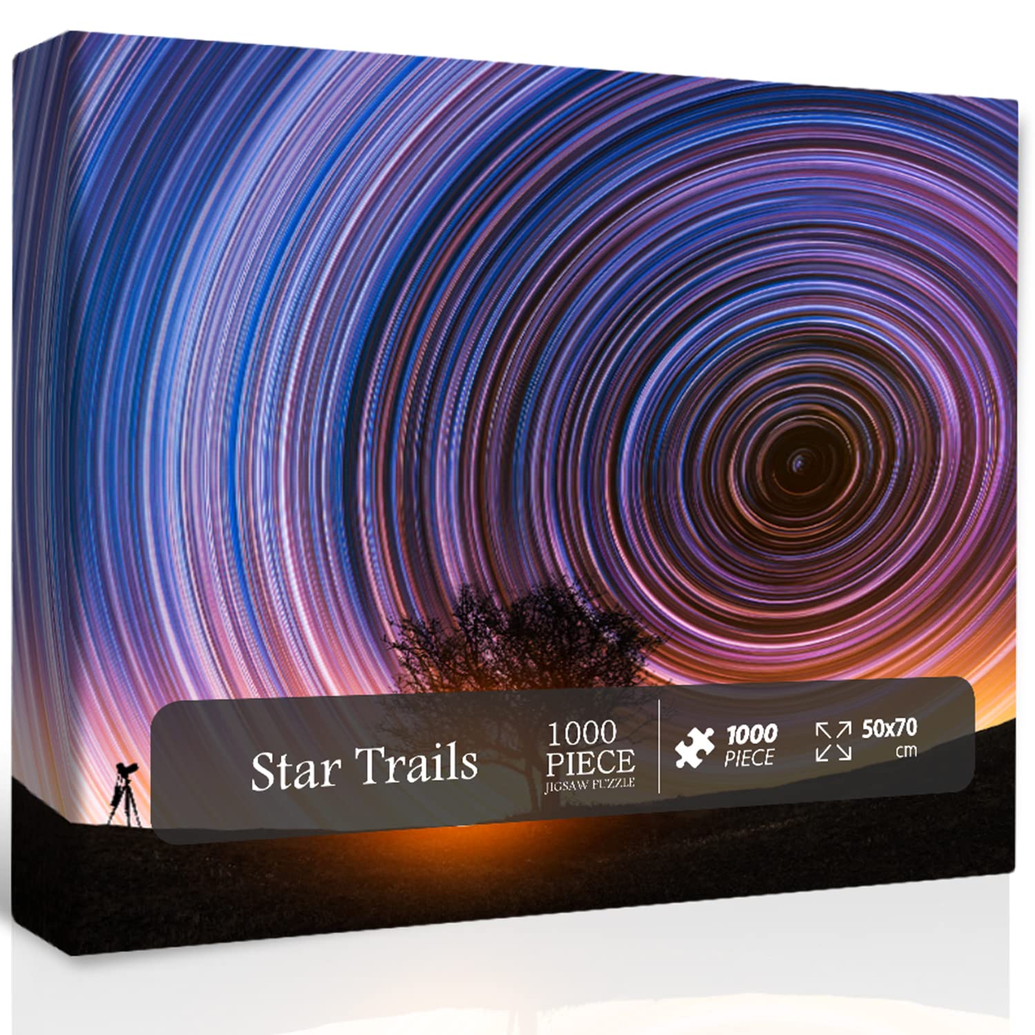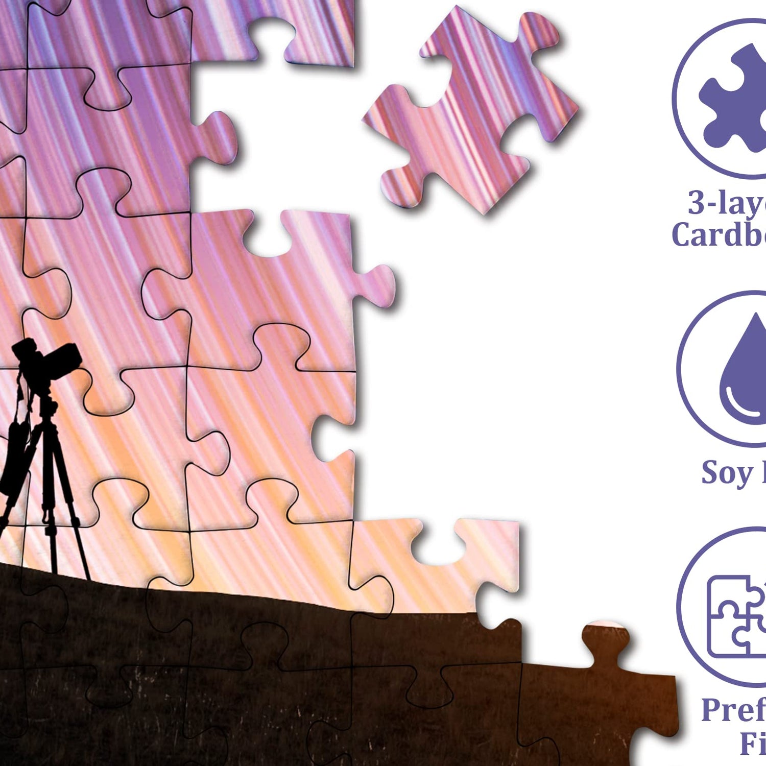 - Scenic jigsaw puzzles for adults:In the difficult puzzles for adults 1000 pieces and up landscape, there is a camera on a tripod, the shadows of trees on the hills and colorful star trails in the sky