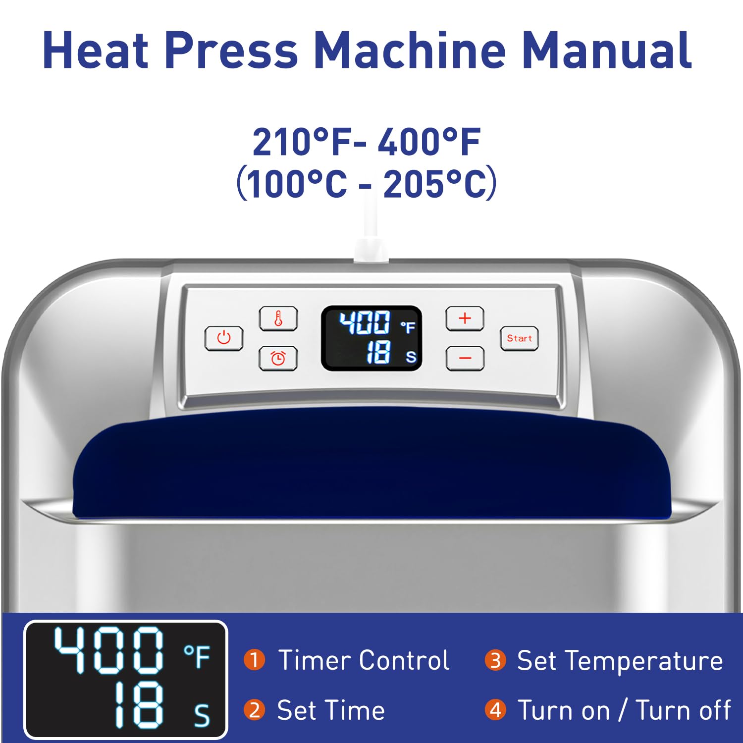 - 【Digitalized Display】- Heat Press Machine features a digital display and adjustable temperature control, allowing you set the fitting temperature210 ºF (100 ºC)-400 ºF (205 ºC) for your specific heat transfer project. Please keep in mind that the heat Transfer machines requires a certain amount of time to heat up. Kindly wait patiently after turning on the machine for optimal results