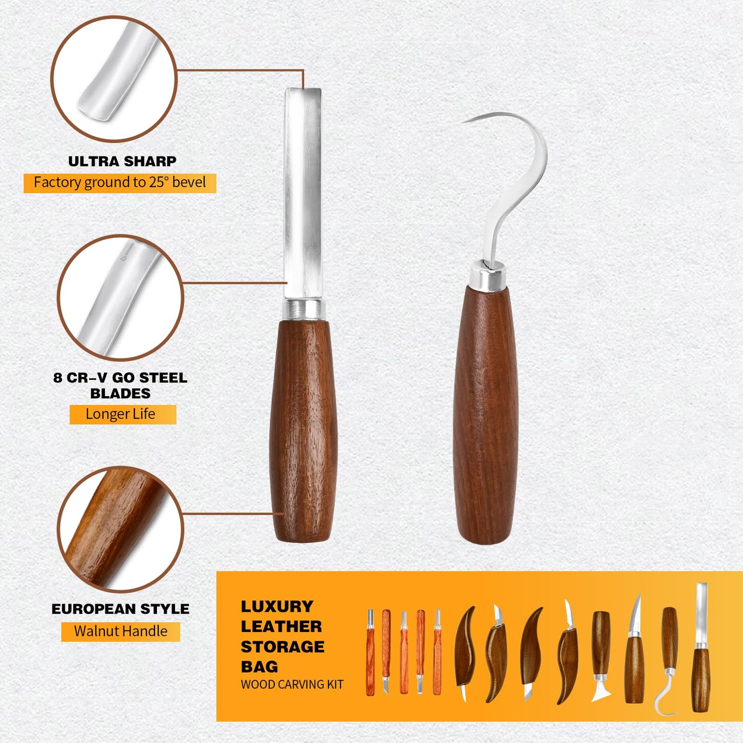 - Wood Whittling Kit Walnut Handles: Each premium wood carving knife in our set boasts a spacious, ergonomically crafted walnut handle that accommodates all hand sizes, ensuring comfortable carving sessions even during extended use.These stylish tools are designed for a great feel in your hand.