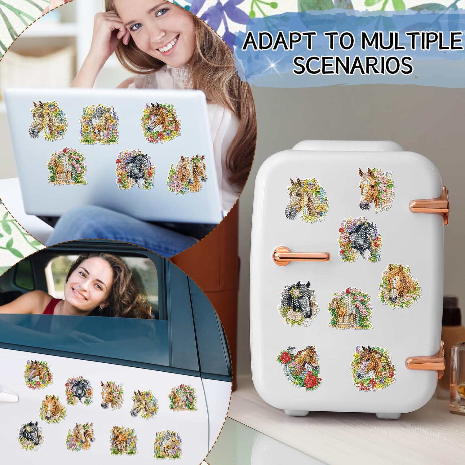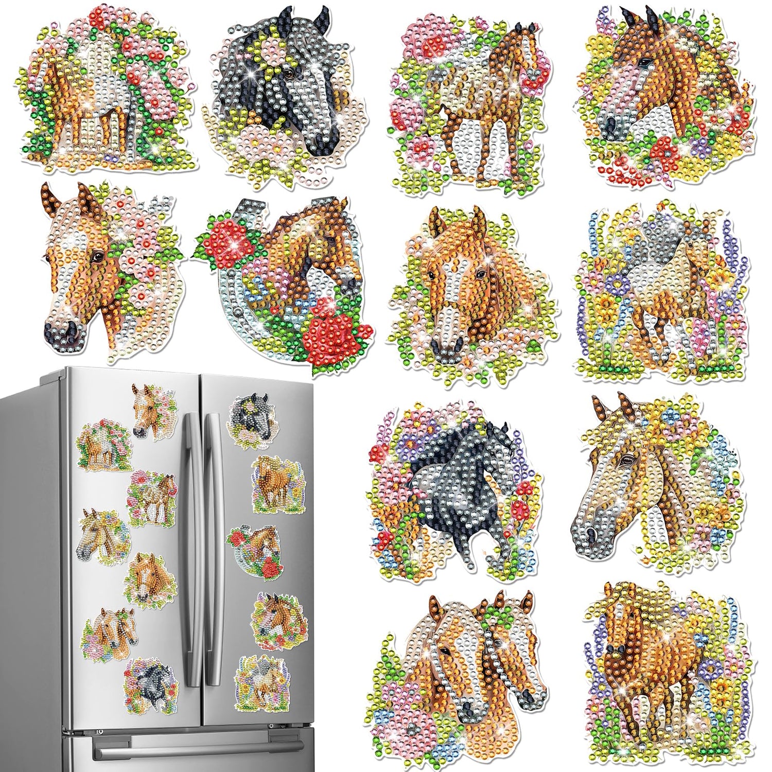 - Package Contents: Our package comes with 12 specifically designed horse themed diamond painting magnets. To add to the fun, each set also comes with an easy to use DIY diamond painting kit that includes a diamond pen, tray, diamonds, and glue; You only need to use a diamond pen to paste the diamonds on the corresponding numbers on the tray; A complete solution for your magnetic decorations needs